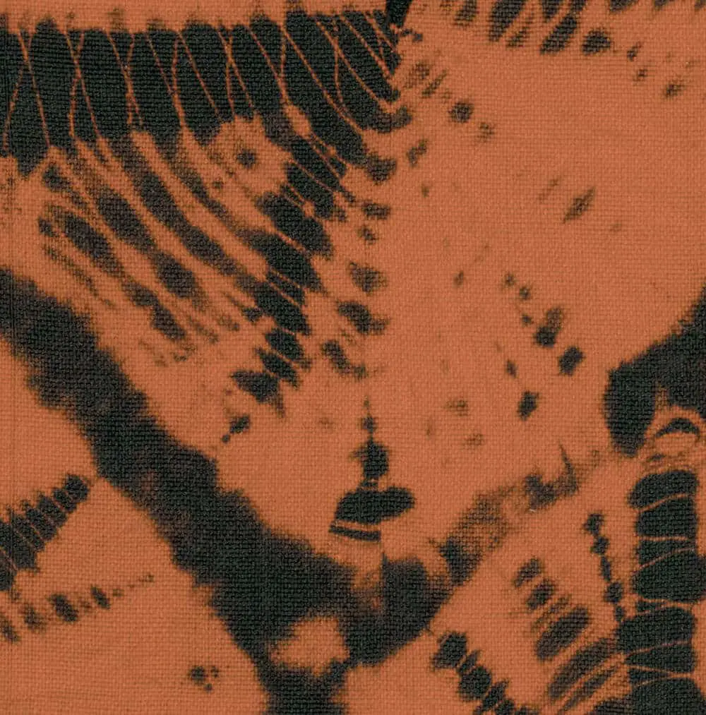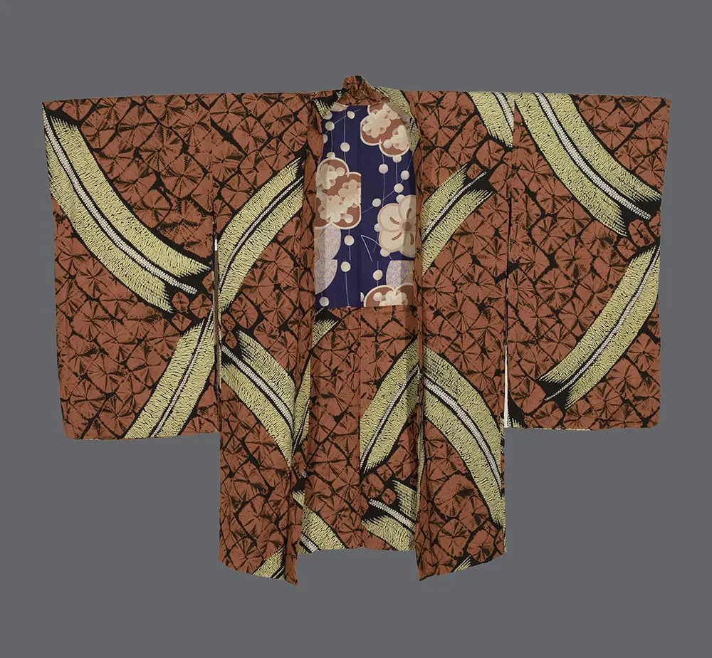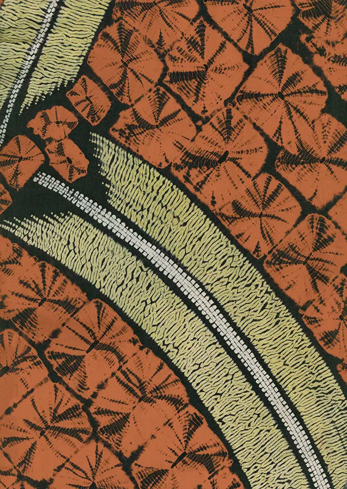 Large, stylized yellow arrow feather (yabane) motifs dominate this bold and dynamic composition, set against a rich terracotta background. The background showcases an intricate shibori pattern of small, repeating geometric shapes, created using the kanoko( fawn spot) shibori technique. This fine patterning provides a textural contrast to the smooth, sweeping lines of the arrow feathers, adding depth and visual interest to the overall design. The shibori technique used to create both the background pattern and the arrow feather motifs demonstrates exceptional skill. The crisp edges and uniform color distribution highlight the artisan's mastery of this complex resist-dyeing method. The bold, geometric background pattern and the use of stylized, repeating motifs are characteristic of Art Deco aesthetics. The color palette, with its striking contrast between the terracotta background and the yellow yabane motifs, evokes the bold color choices often seen in modernist art.