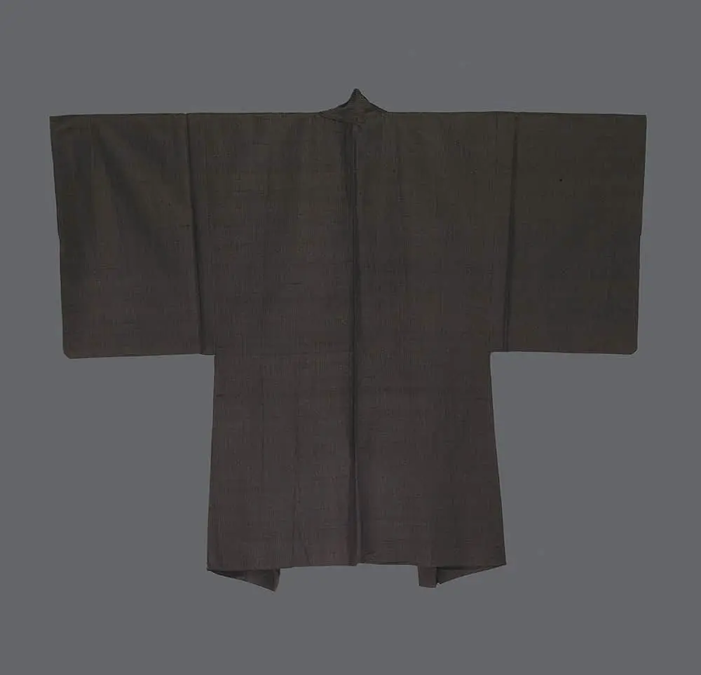 This sheer silk man's summer jacket features subtle alternating vertical stripes in black and grey. Its slight stiffness serves a purpose, enabling this unlined summer garment to maintain its shape. It's in excellent condition, measuring 51 inches (130 cm) from sleeve-end to sleeve-end and standing at 31 inches (79 cm) in height.