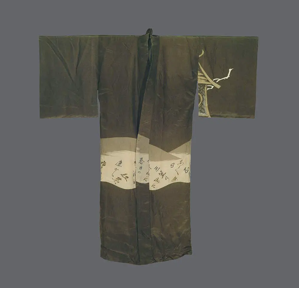 This lined silk kimono for men features a fine, sturdy silk and is in excellent condition. It measures 50 inches (127 cm) from sleeve-end to sleeve-end and stands at a height of 54 inches (137 cm).