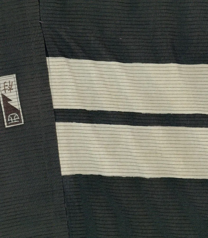 The artistic treatment reflects the refined minimalism of Japanese decorative arts, where negative space plays as crucial a role as the positive design elements. This approach echoes the broader Japanese artistic philosophy found in everything from garden design to calligraphy, where restraint and suggestion are valued over elaborate ornamentation. Given the garment's association with Kyogen theater and the Shishimai Lion Dance Festival, the crest likely served both as family identification and as a marker of the wearer's artistic and social status within the traditional performing arts community. The bold contrast between the light crest and dark fabric would have been particularly effective on stage, ensuring visibility during theatrical performances while maintaining the elegant restraint characteristic of Japanese textile design.