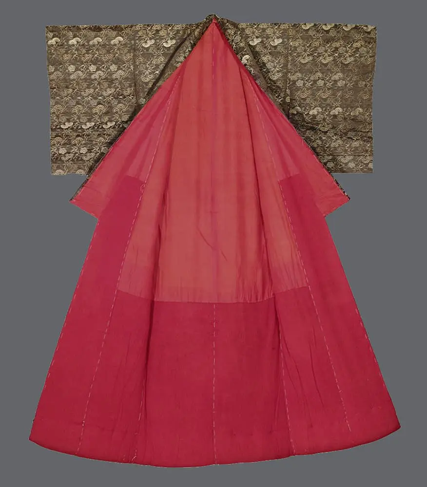 The interior lining of benibana red chirimen silk crepe adds another layer of symbolic meaning and luxury to this ceremonial garment. Benibana, derived from safflower, was one of the most precious dyes in traditional Japan, its deep red color symbolizing life force, fertility, and protection against evil spirits - all essential qualities for a bride embarking on married life. The contrast between the sophisticated, muted exterior and the vibrant red interior creates a powerful visual metaphor for the transformation of the bride.