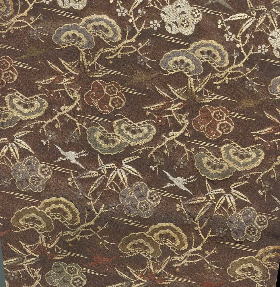 This silk brocade uchikake features an exquisite all-over pattern that weaves together the most auspicious symbols in Japanese culture into a unified celebration of matrimonial joy and prosperity. The garment showcases the classical "Three Friends of Winter" (sho-chiku-bai) - pine, bamboo, and ume (plum) blossoms - combined with graceful cranes in a sophisticated brocade technique that creates subtle dimensional effects through the interplay of gold and silver threads against the rich brown silk ground. This combination of motifs represents the ultimate expression of good fortune: the pine symbolizing longevity and steadfastness, bamboo representing flexibility and resilience, ume blossoms signifying perseverance and renewal, and cranes embodying longevity and marital fidelity.