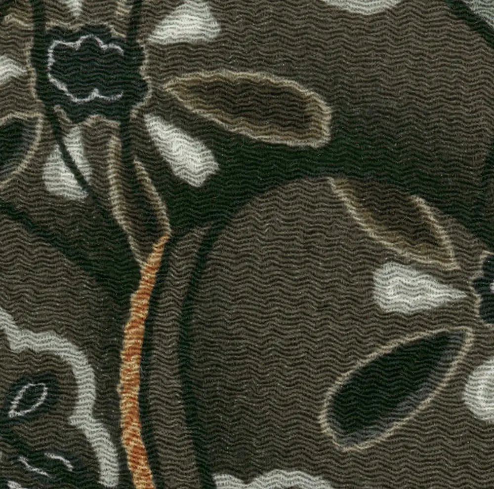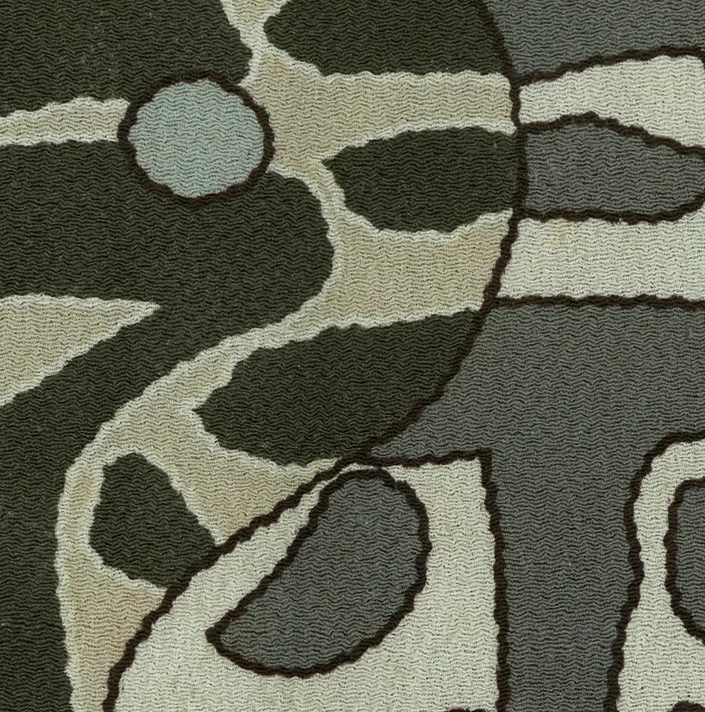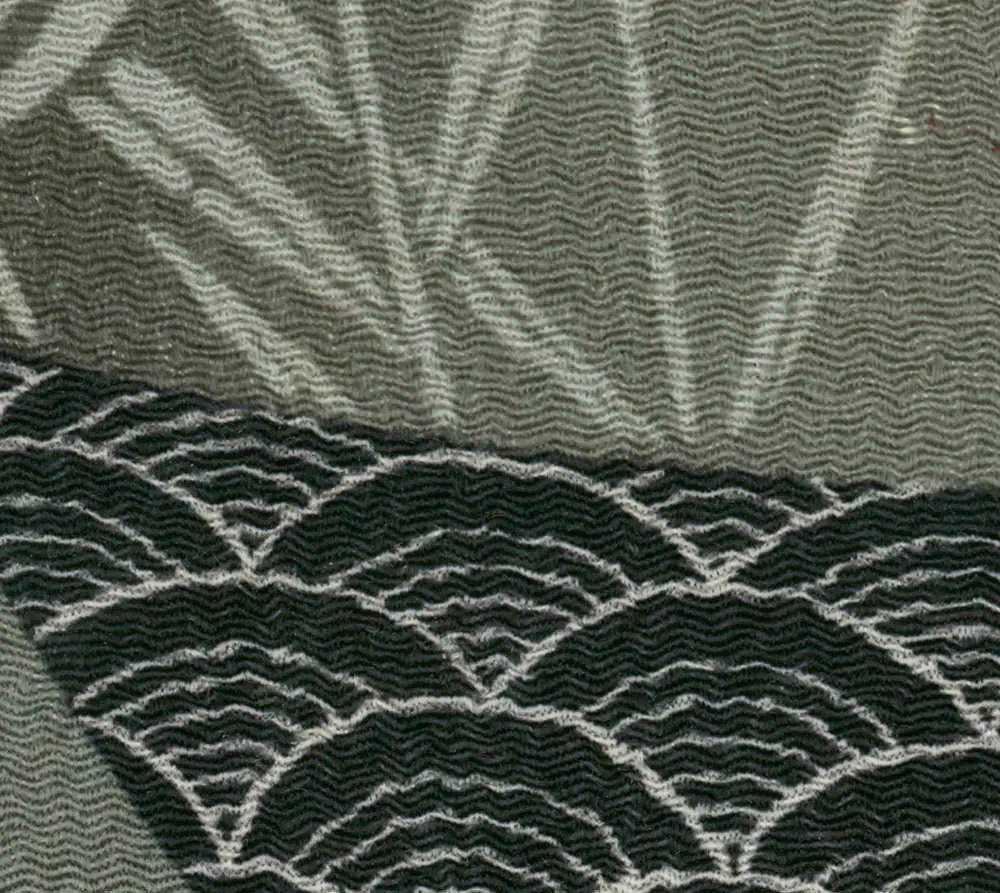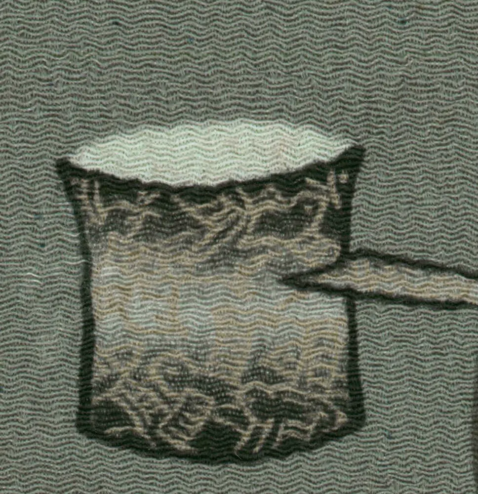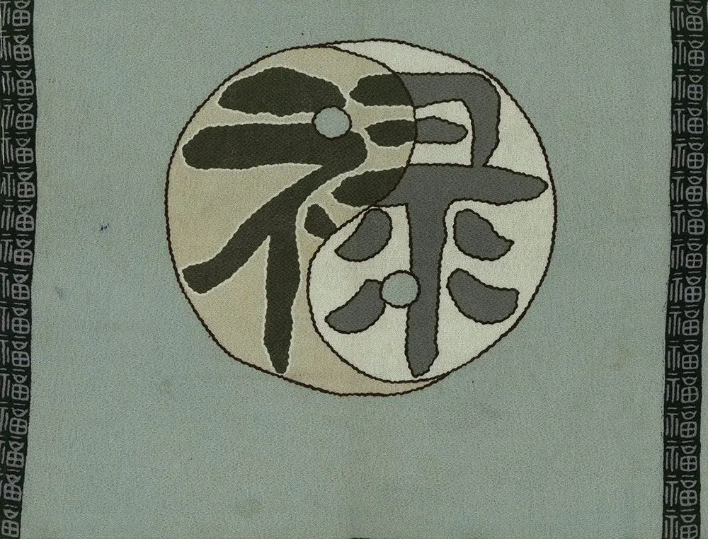 This chirimen-silk fukusa displays yuzen-dyed designs, featuring a sake bottle on the front and a kanji symbol representing 'fuku' (fortune) on the backside. Despite slight staining, it's in good condition and measures 16 inches by 16 inches (41 cm x 41 cm).