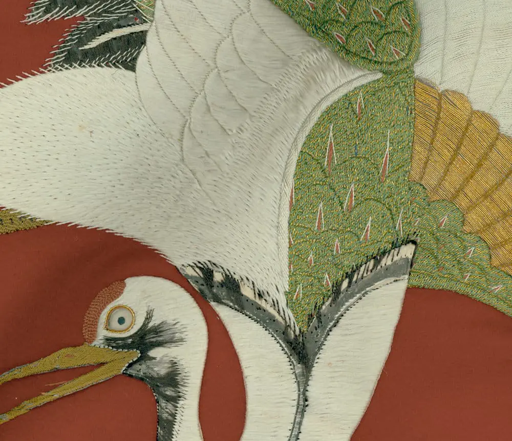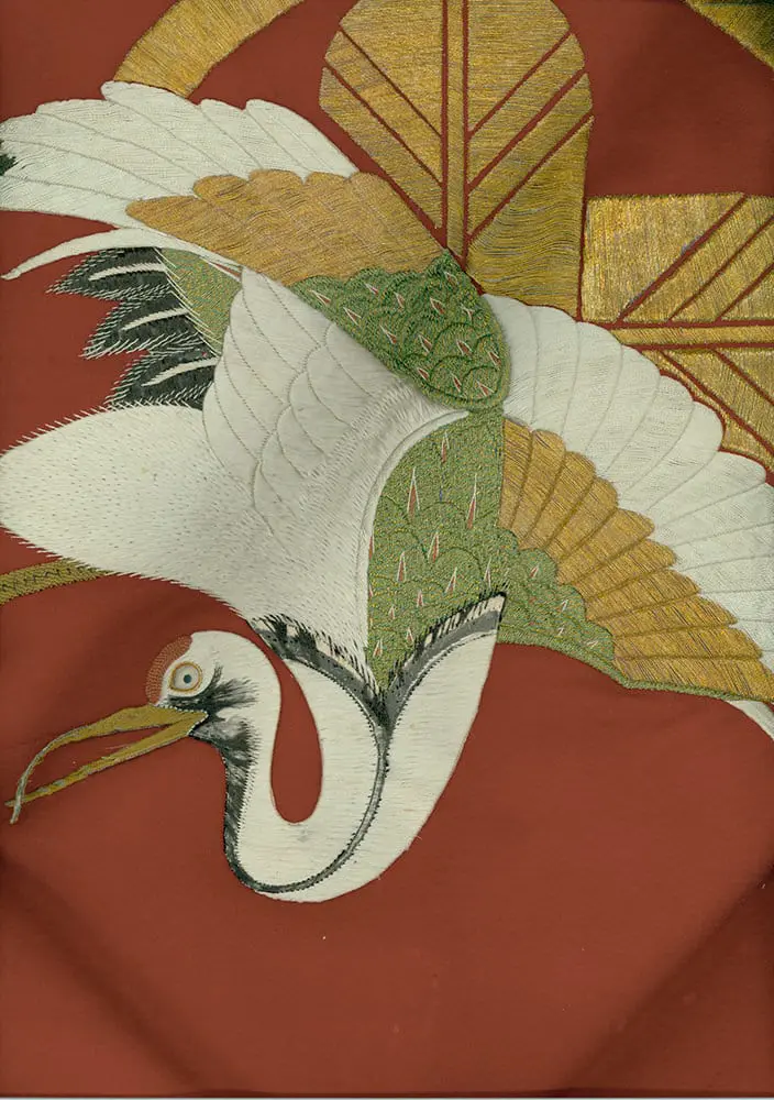 This embroidered gift cover presents relatively coarse metallic and silk embroidery on a bast fiber base. It measures 26 inches by 26 inches (66 cm x 66 cm). There are some areas requiring minor mending, notably the lower beak unstitched from the background and a few other small points. The family crest features falcon feathers, symbolizing both the military and various Japanese shrines. Additionally, the mandarin crane depicted stands as a symbol of good fortune and longevity.