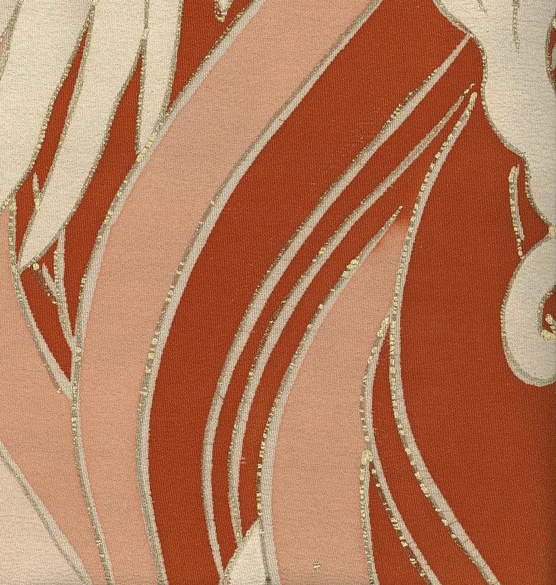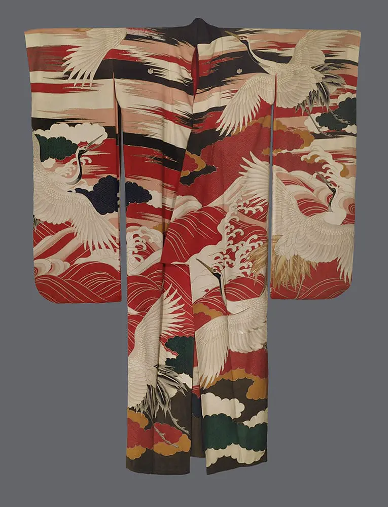 The artistic execution combines multiple techniques to achieve extraordinary visual depth and richness. The simple and couched embroidery creates textural variety across the birds' plumage, while the yuzen-painting allows for subtle color gradations in the atmospheric elements. The intricate gold outlining not only defines forms but also catches light to animate the entire composition, creating the impression of cranes in perpetual flight through shifting clouds and mist. This technique reflects influences from both traditional Japanese decorative arts and the emerging Art Deco movement's emphasis on metallic accents and stylized natural forms.