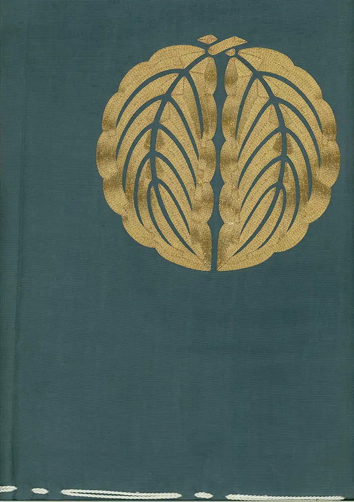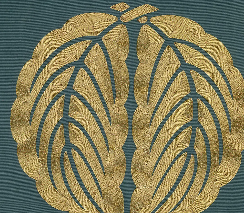 This silk fukusa, measuring 26 inches x 26 inches (66 cm x 66 cm), showcases a prominent family crest of an oak leaf meticulously crafted with intricate metallic embroidery-couching. It remains in very good condition overall.