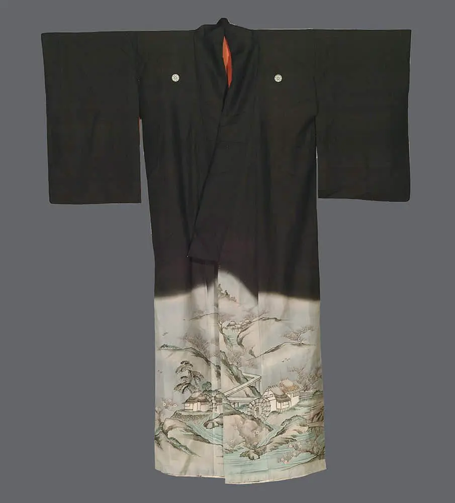 This silk kimono features a masterful sumi-e landscape painting of a serene mountain village scene with traditional thatched-roof buildings nestled among rolling hills, executed with the subtle gradations and soft washes typical of sumi-e technique.