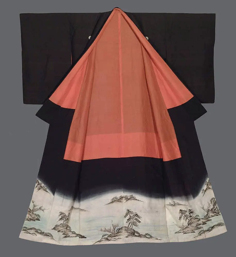 its interior is adorned with beni red plain weave gauze. This piece measures 49 inches (124 cm) from sleeve-end to sleeve-end, with a height of 59 inches (150 cm).