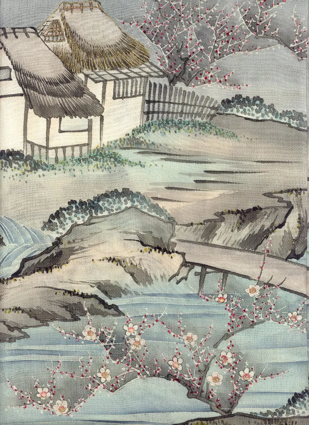 The landscape includes winding streams and a small bridge, elements that represent life's journey and the connection between different realms or states of being in Japanese symbolic tradition. The traditional buildings with their distinctive architecture evoke rural tranquility and connection to ancestral ways of life. The craftsmanship combines multiple sophisticated embroidery techniques including sagara (French knot-style raised embroidery) for textural elements, couching for linear details, and regular embroidery, all executed on luxurious chirimen silk that provides the perfect canvas for this painterly composition.