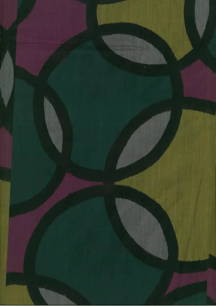This meisen silk haori displays a striking geometric pattern of interlocking circles rendered in a vibrant color palette of deep teal, chartreuse yellow, dusty rose, and cream against black outlines. The repetitive circular motifs create an overlapping network that fills the entire surface of the garment, demonstrating the sophisticated resist-dyeing techniques characteristic of meisen silk production. The bold, geometric abstraction and strong color contrasts reflect the influence of Art Deco and early modernist design movements, representing a fusion of traditional Japanese craftsmanship with contemporary aesthetic sensibilities.