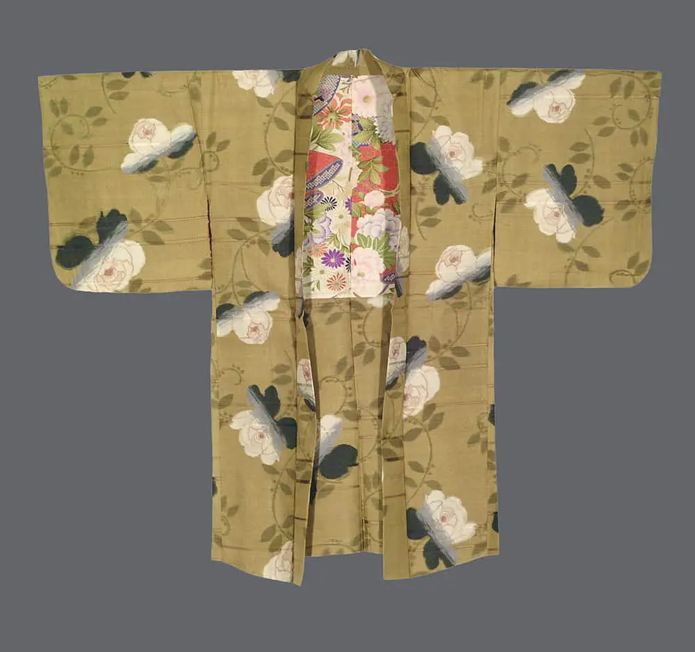 This meisen silk jacket showcases rose patterns and is in very good condition. It measures 47 inches from sleeve-end to sleeve-end and stands at 38 inches in height (119 cm x 97 cm).