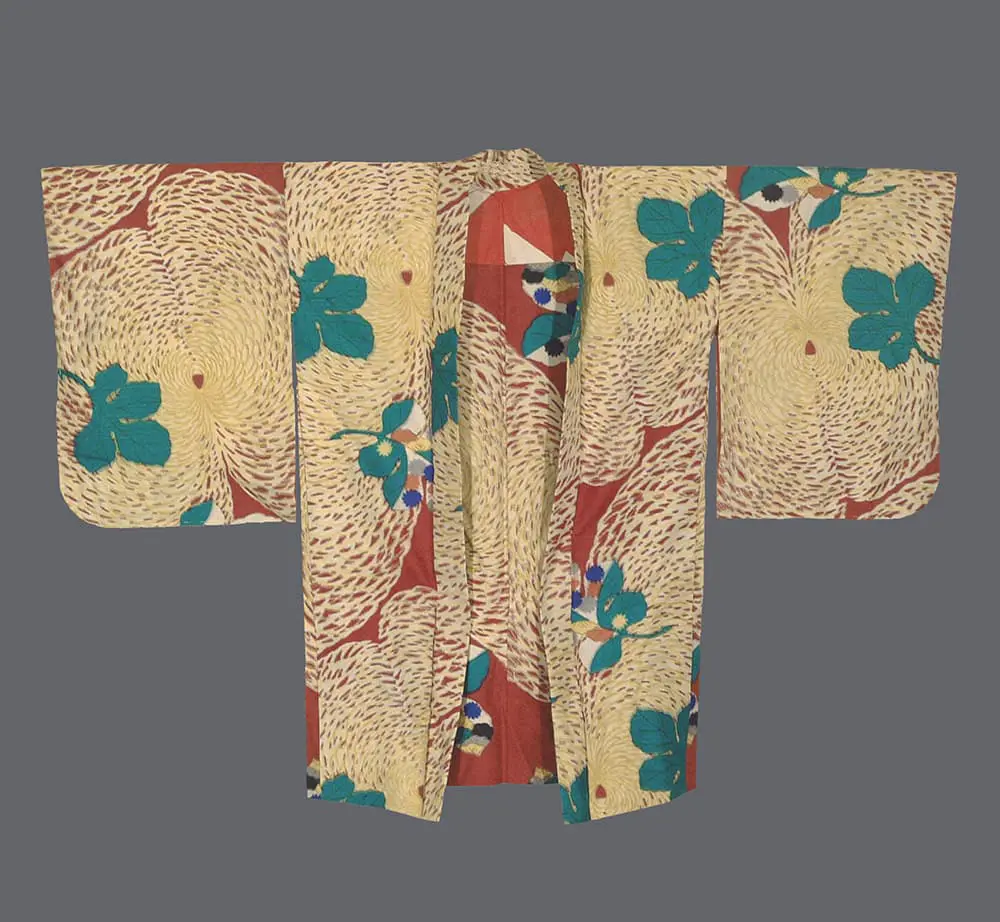 The oak leaf holds particular significance in Japanese culture as a symbol of strength, endurance, and nobility, making it an especially meaningful motif during the reconstruction period following World War II when themes of resilience and renewal were culturally resonant. This garment reflects the aesthetic boldness that characterized meisen production during its golden age, when mass-production techniques allowed for more experimental and affordable designs that could incorporate Western color sensibilities while maintaining Japanese symbolic content. The dynamic composition and saturated colors show clear influence from mid-century modern design movements, particularly in the way traditional natural forms are abstracted into bold graphic patterns that emphasize surface decoration over naturalistic representation.