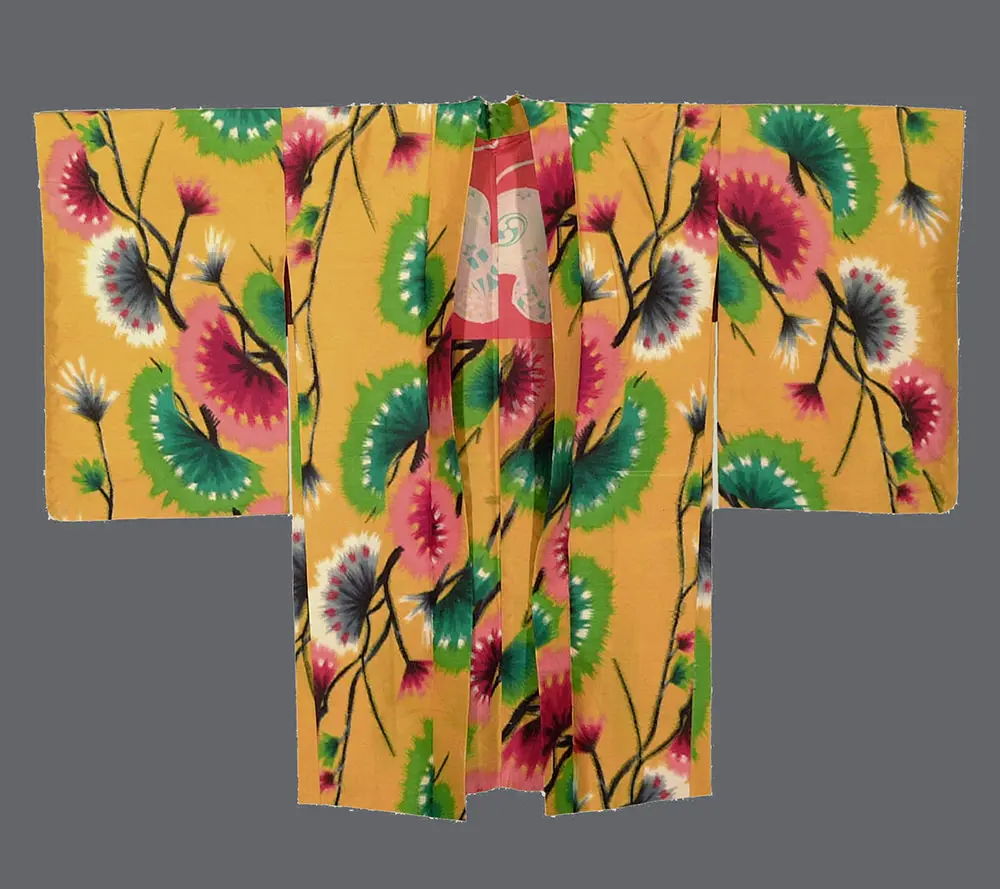 Traditional Japanese textile art meets Art Nouveau and early modernism in the striking patterns of this meisen silk composition. Pine motifs, rendered in a bold, modernist style, transform the traditional Japanese pine (matsu) symbol into something strikingly contemporary. These motifs, in green, pink, and white against a golden yellow background, create a dynamic composition that embodies the Japanese concept of 'notan' - the interplay between positive and negative space. Its bold, geometric interpretation of natural forms evokes the organic curves and naturalistic patterns characteristic of Art Nouveau. The color palette, particularly the use of mustard yellow as a background, reflects the influence of Japonisme on Western art while remaining distinctly Japanese in its execution. The overall design shows an interesting tension between traditional Japanese textile patterns and modernist abstraction, presaging elements that have an affinity to Op Art and Abstract Expressionism through its use of repetitive, almost hypnotic patterns and bold color contrasts. Additionally, the bold, stylized forms and vivid color palette evoke the aesthetics of the Fauvist movement, characterized by artists such as Henri Matisse and André Derain, known for their use of strong colors and abstracted forms to convey emotion. The lush greens, pinks, and yellows create a visual impact reminiscent of the wild, expressive brushwork seen in Fauvist paintings.