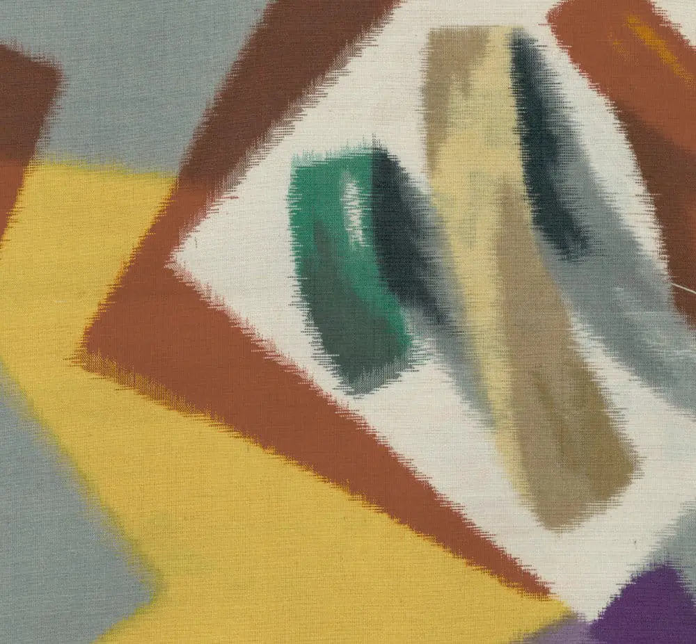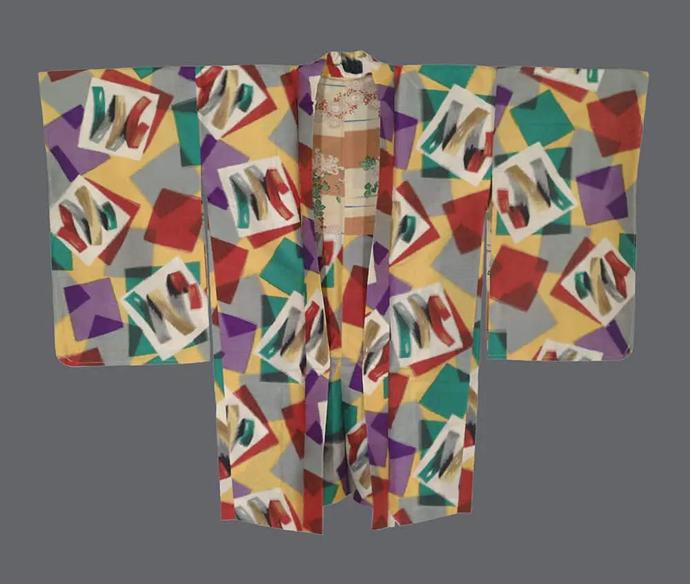 Vibrant and playful exploration of abstract forms and colors marks this meisen piece. The composition fills with dynamic shapes arranged in a seemingly random yet balanced pattern against a yellow ground. The color palette emerges bold and diverse, with blocks of red, green, purple, and light grey. The overall aesthetic strongly suggests a connection to Western modern art movements, particularly Cubism and Art Deco. The fragmented shapes, overlapping planes, and dynamic composition evoke the Cubist aesthetic, while the stylized motifs and bold color palette resonate with Art Deco sensibilities. This haori exemplifies the artistic experimentation that characterized haori and kimono design in early 20thcentury Japan, where artists eagerly embraced and reinterpreted Western modernism. The design also hints at influences from the Japanese avant-garde movement of the 1920s and 1930s. Artists associated with this movement, such as those in the Mavo group, sought to integrate art into everyday life and explored bold new forms of expression, often drawing inspiration from Western avant-garde movements like Constructivism and Futurism.