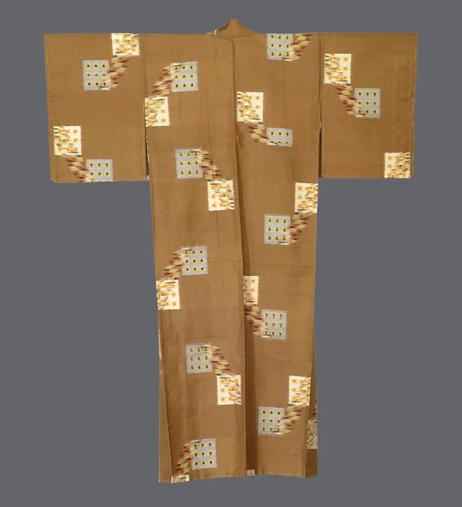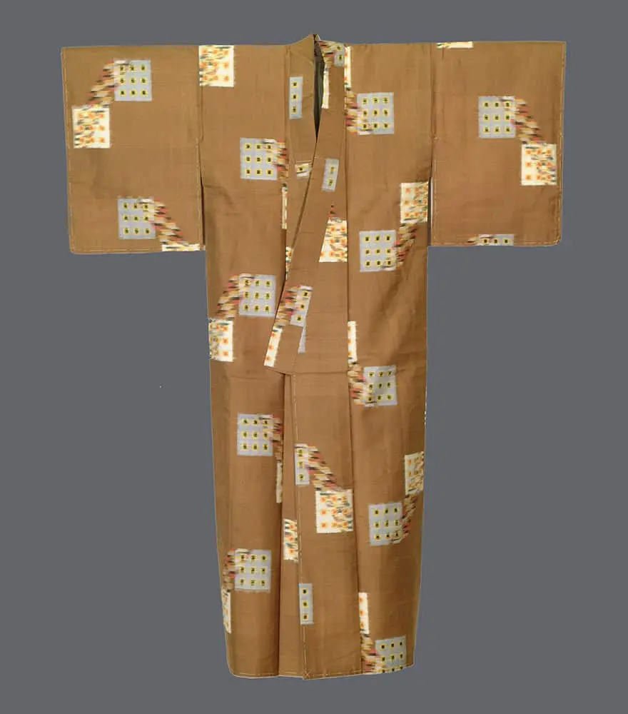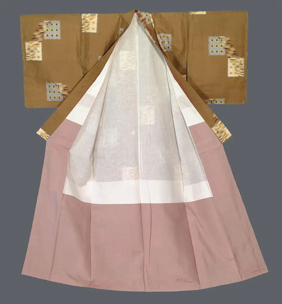 This excellent condition meisen silk kimono is complemented by a cotton lining. Its dimensions are approximately 48 inches (122 cm) from sleeve-end to sleeve-end and 59 inches (150 cm) in height.