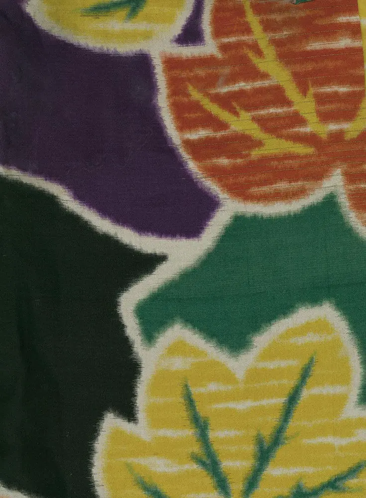 This meisen silk kimono exemplifies the bold graphic sensibility that defined Japanese textile design during the interwar modernist period. The composition features an exuberant display of oversized autumn maple leaves rendered in vibrant orange, golden yellow, and deep emerald green against a dramatic black ground, with purple accents that create striking color harmonies reminiscent of Art Deco color palettes. The leaves appear to float and overlap in a dynamic, all-over pattern that breaks from traditional Japanese design conventions of asymmetrical placement, instead embracing a more Western approach to surface decoration that reflects the period's cultural exchanges.
