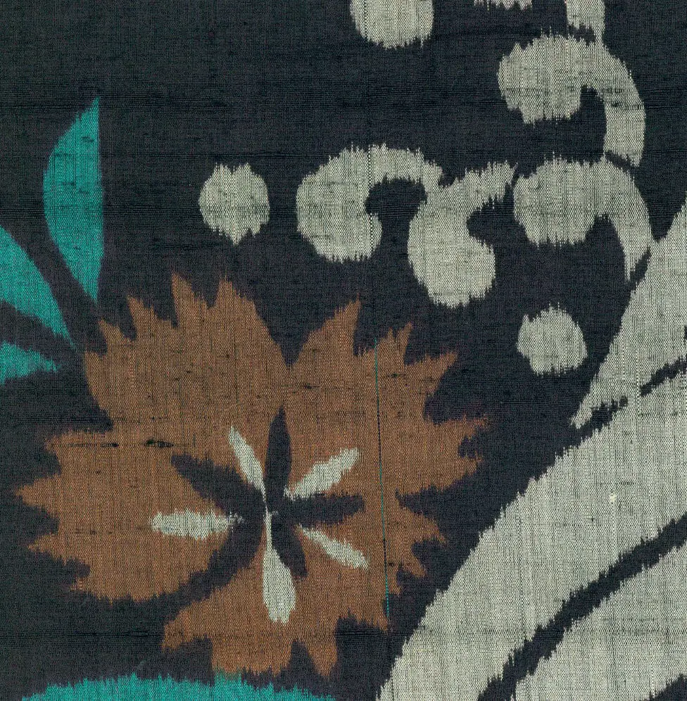 This meisen silk kimono displays a dynamic wave pattern, rendered in striking turquoise and cream against a rich brown ground, demonstrating the meisen weaving technique's capacity for creating complex, repeating designs through resist-dyeing methods. The stylized waves evoke the powerful maritime imagery found in Japanese art from Hokusai's iconic prints to contemporary interpretations, symbolizing strength, resilience, and the eternal flow of life, while their rhythmic repetition across the entire garment creates a sense of movement and energy befitting the modern era.