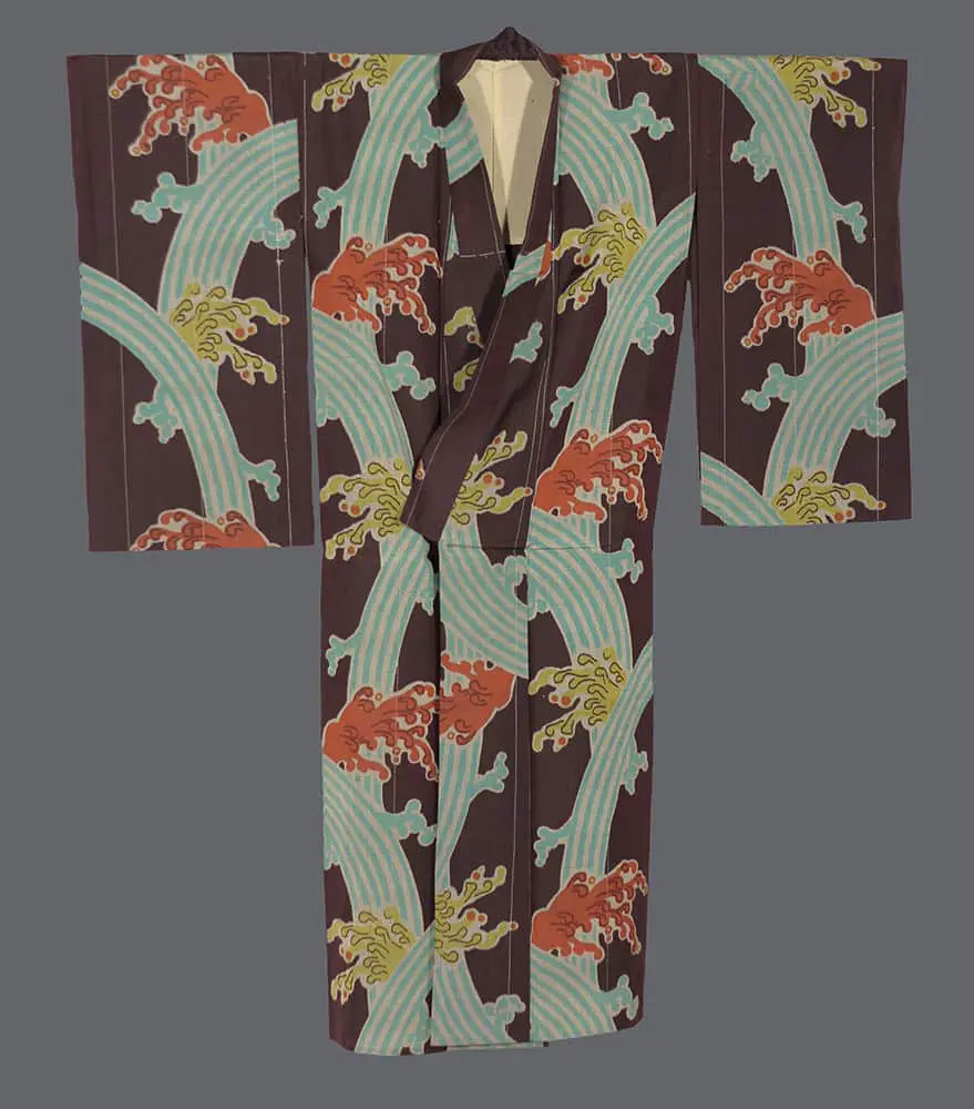 The meisen technique, which allowed for more experimental and affordable silk production, was perfectly suited to this kind of innovative design that bridged traditional Japanese aesthetics with contemporary international style movements. The sophisticated interplay between the flowing currents and explosive splash forms demonstrates how Japanese textile artists of this era successfully synthesized ancient symbolic vocabularies with the bold graphic sensibilities of early 20th-century modernism, creating garments that were both culturally resonant and stylistically progressive in their interpretation of water's endless movement and transformative power.