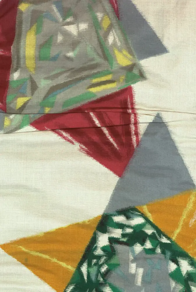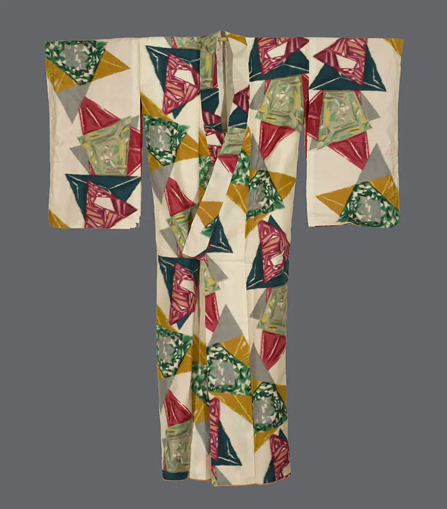 This silk meisen kimono exemplifies the bold modernist aesthetic that emerged in Japanese textile design during the interwar period, reflecting the influence of Art Deco and geometric abstraction that was sweeping through decorative arts globally. The design features a dynamic composition of angular, faceted forms that fragment and reconstruct rose motifs into crystalline geometric patterns, rendered in a striking palette of coral pink, emerald green, golden yellow, and deep teal against a cream ground. The roses have been completely deconstructed from their naturalistic forms and reimagined as sharp-edged polygonal shapes that interlock and overlap in a rhythmic, kaleidoscopic arrangement across the entire garment.