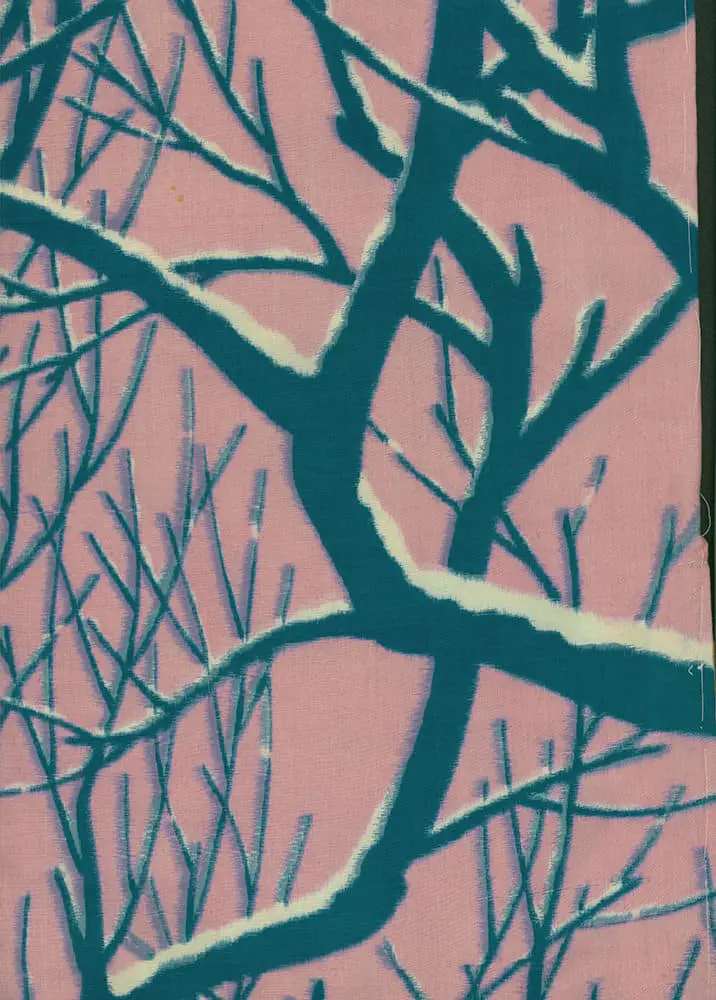The composition reflects strong influences from the Art Deco movement, evident in the bold geometric abstraction of natural forms and the sophisticated two-color palette that eschews the more complex polychromatic schemes of classical kimono design. The branch motifs are stylized into angular, interconnected lines that create an all-over pattern with remarkable visual rhythm and movement. This approach shows clear parallels to the decorative arts movements of the 1920s and 1930s, where natural forms were increasingly geometricized and simplified into powerful graphic statements.
