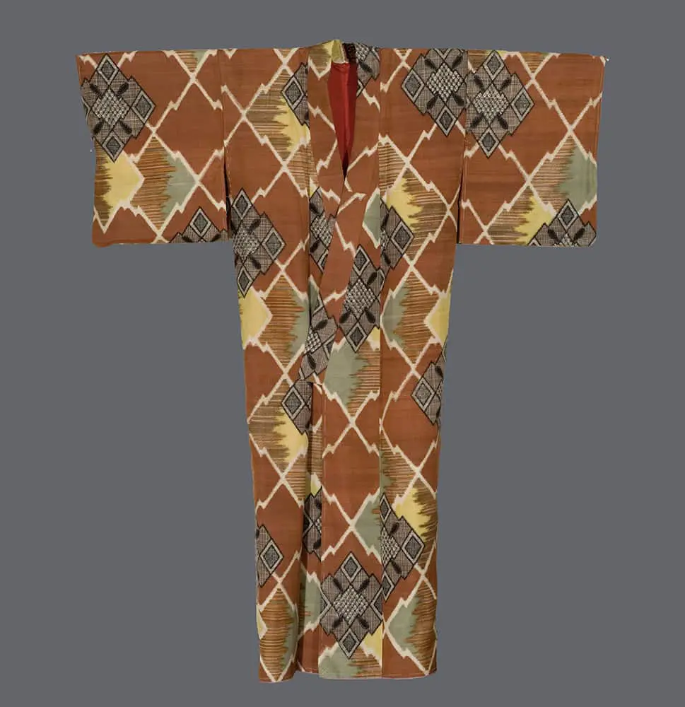 The meisen weaving technique employed here represents one of the most innovative developments in Japanese textile production of the 20th century, utilizing a complex ikat-style process where both warp and weft threads are resist-dyed before weaving to create precise geometric patterns. The supplementary weft inserts visible in the design add dimensional texture and visual interest, creating subtle variations in the surface quality that enhance the overall geometric composition. The earth-toned palette of russet browns, sage greens, and golden yellows reflects the period's embrace of more muted, sophisticated color schemes that departed from the brighter hues of earlier decades, suggesting influences from both Bauhaus color theory and traditional Japanese aesthetic restraint.
