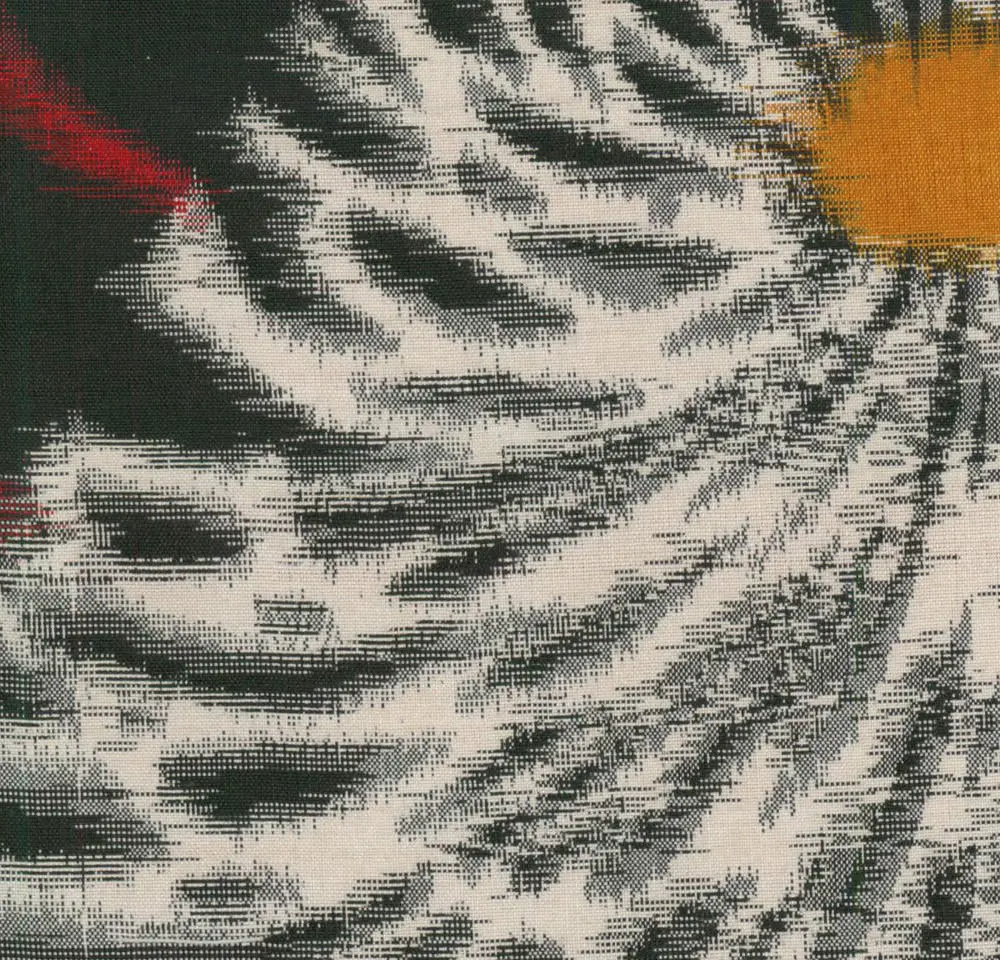 The chrysanthemum motif carries deep symbolic significance in Japanese culture, representing longevity, rejuvenation, and nobility. As the imperial flower and symbol of autumn, the kiku also embodies themes of endurance and the cyclical nature of life. The artist's interpretation transforms the traditional floral motif into something distinctly modern, with the chrysanthemums' radiating petals creating an almost kinetic quality that reflects the period's fascination with motion and industrial dynamism. The alternating color scheme and diagonal arrangement create visual rhythm across the garment.