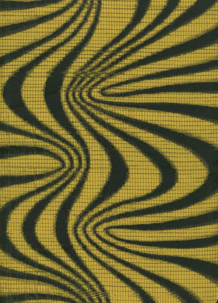 This meisen silk kimono features a striking optical pattern that creates a powerful sense of movement and visual dynamism. The design consists of flowing, undulating lines in black against a golden yellow background, forming swirling, wave-like motifs that seem to pulse and shift across the fabric's surface.
