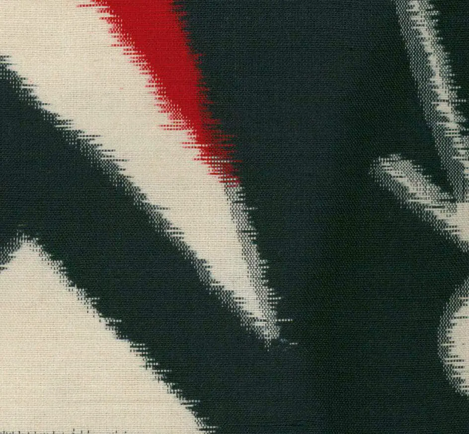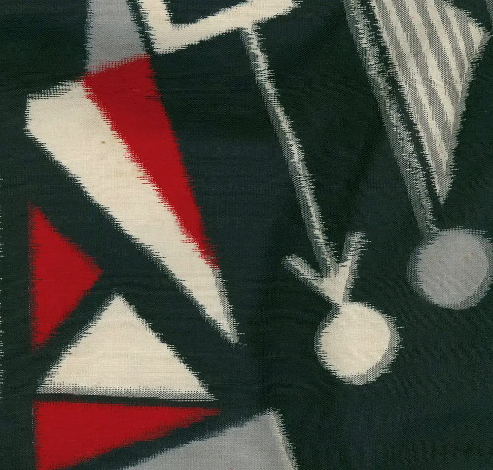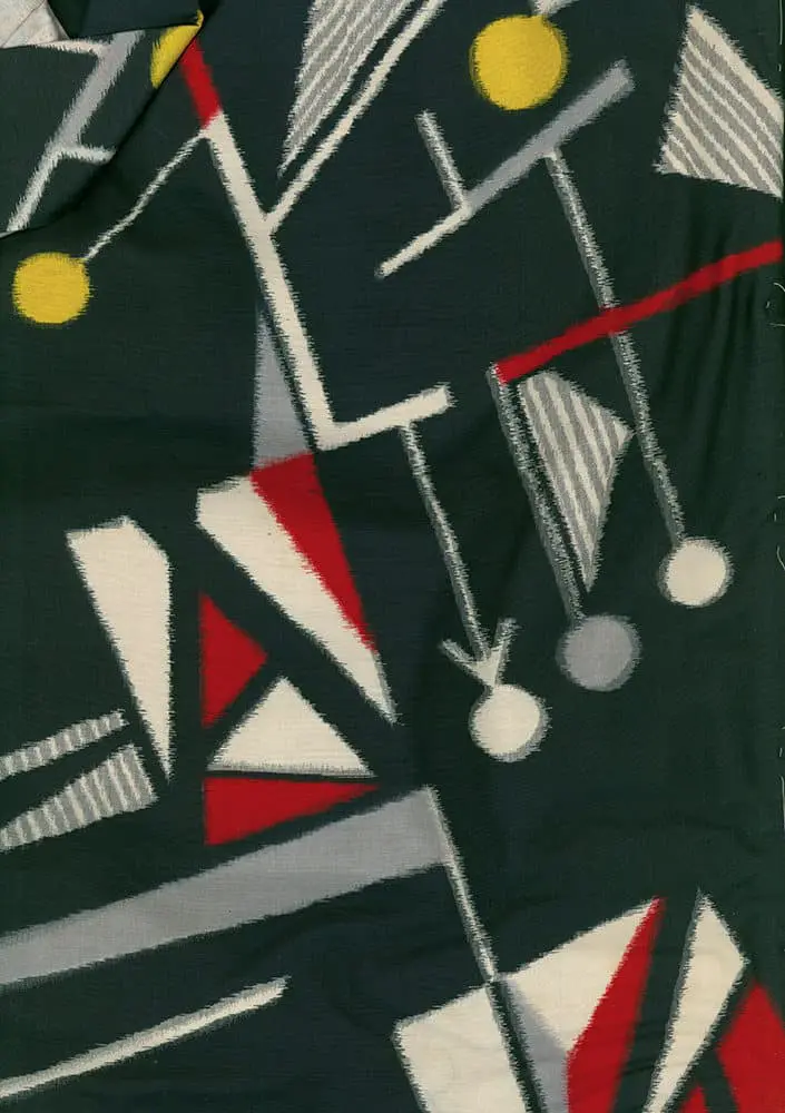 Bauhaus influence is evident in the functional, machine-age aesthetic and the integration of art with textile production. The design demonstrates the Bauhaus principle of bringing modernist art into everyday objects.