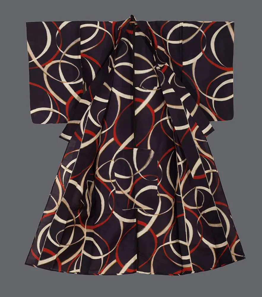 The overall effect is one of elegant dynamism, with the swirling pattern creating visual energy while maintaining the refined proportions and construction techniques of traditional kimono-making.