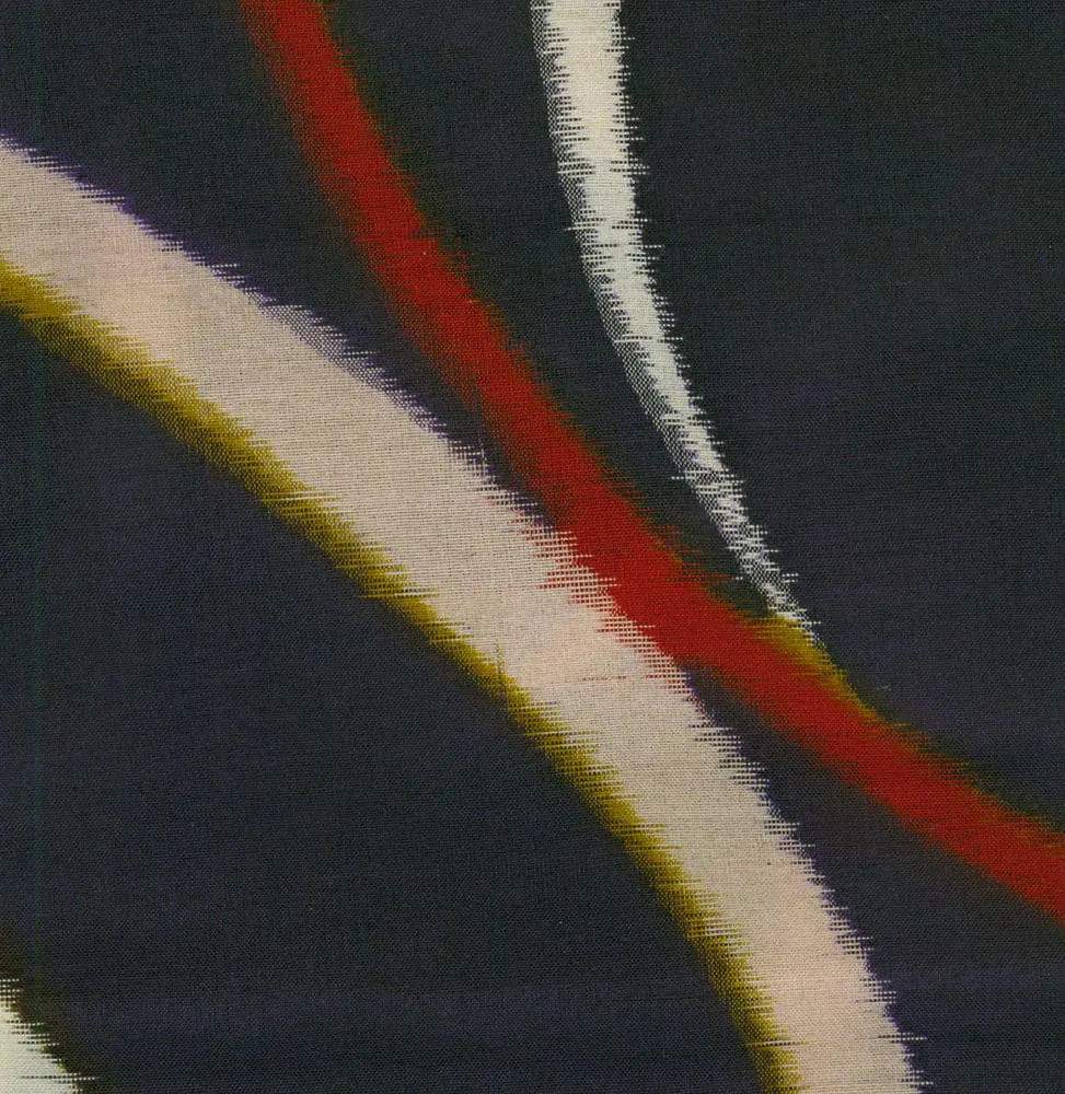 This hitoe (unlined) meisen silk kimono has a design built around a dynamic pattern of interlocking curved lines that create an energetic, almost musical rhythm across the black ground. The pattern consists of flowing, ribbon-like bands in cream white and vivid red-orange that weave and intersect throughout the composition, forming circular and oval shapes as they curve and overlap. This creates a sense of continuous movement that would have been particularly striking when worn and in motion.