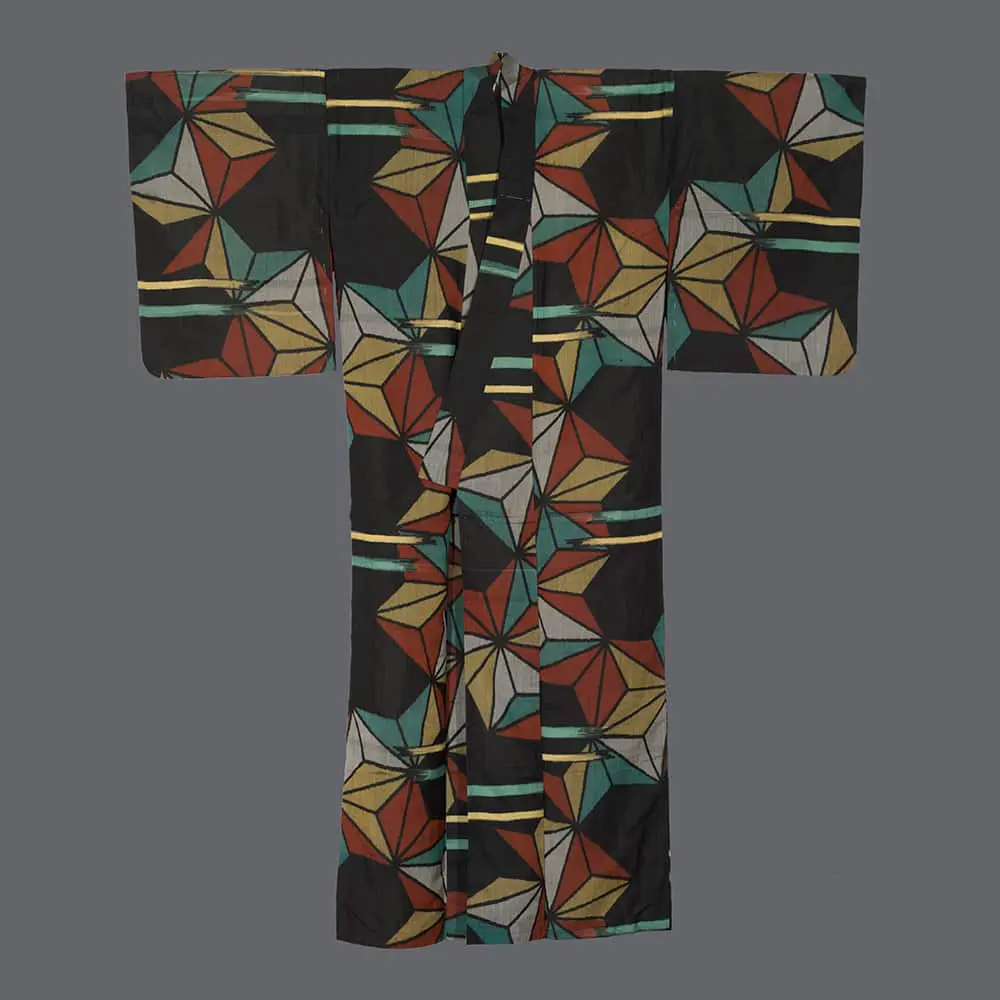 What makes this kimono particularly notable is how it bridges traditional Japanese pattern-making with the international modernist aesthetic that was gaining influence in Japan during this period. The bold color choices and the addition of linear elements reflect the impact of Art Deco and other contemporary design movements, while maintaining the essential geometric logic of the classical asanoha form.