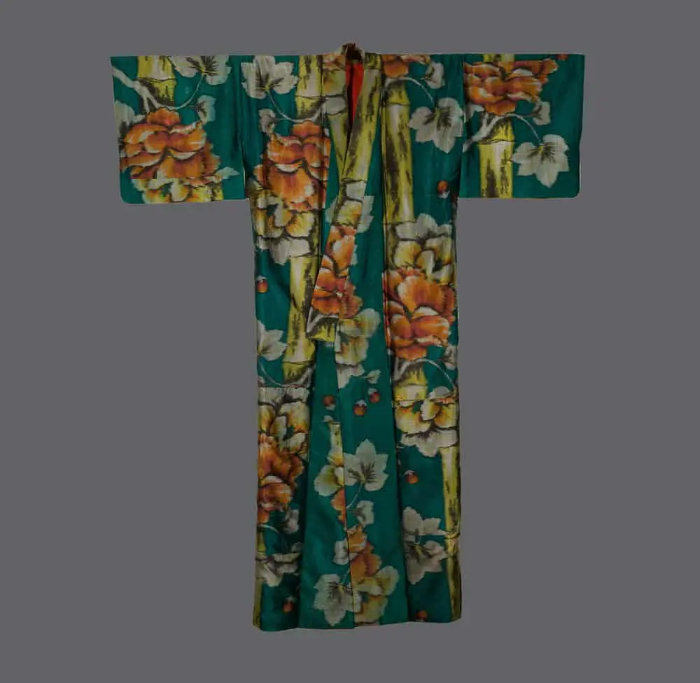 Symbolically, this kimono represents prosperity and honor through its prominent peony motifs, as peonies (botan) are considered the "king of flowers" in East Asian culture, symbolizing wealth, nobility, and good fortune. The bamboo elements add layers of meaning, representing resilience, flexibility, and rapid growth, while also suggesting the approach of summer seasons. Together, these motifs create an auspicious combination celebrating both material abundance and spiritual strength. The meisen technique's ability to produce such vivid, saturated colors particularly enhances the celebratory nature of these symbolic elements, making this kimono suitable for festive occasions despite its current condition challenges.