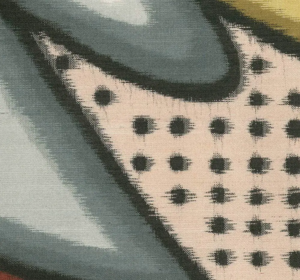 This 1950s meisen silk haori displays a bold, dynamic pattern that evokes the energy and visual language of Western Pop Art and Art Deco movements. The design is composed of overlapping, cloud-like shapes in muted yellows, reds, and blues, sharply outlined in broad, dark lines that recall both the comic-inspired “Ben-Day dots” of Roy Lichtenstein and the streamlined curves of Art Deco aesthetics. The dotted background—a common Pop Art technique—further enhances this association by mimicking commercial printing processes, lending the textile a graphic, almost mechanical feel. In Japanese symbolism, cloud motifs (kumo) often represent transition, change, or the ethereal beauty of nature, sometimes suggesting the flow of time or moments of ephemerality. The combination of traditional symbolic motifs and avant-garde, modernist styling on this haori speaks to the postwar period’s embrace of innovation and cultural exchange