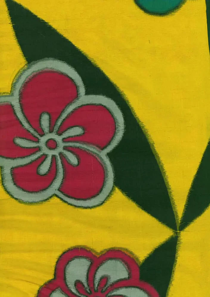 The flowers themselves are rendered in an almost Pop Art-like simplification, with pink and green blooms outlined in white that appear almost graphic or logo-like in their execution. This treatment of traditional Japanese motifs in a bold, simplified manner seems to anticipate aspects of Pop Art's approach to imagery, though emerging from a distinctly Japanese design context. The color palette is particularly striking - the combination of bright yellow background with black geometric elements, hot pink and emerald green flowers creates a visual impact that feels surprisingly contemporary while still maintaining connections to traditional Japanese textile arts.