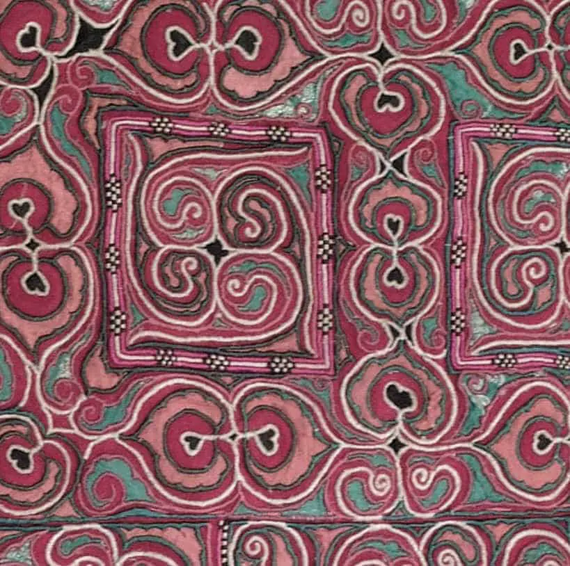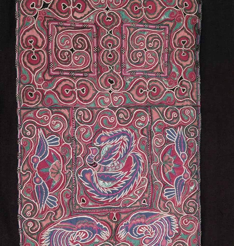 This piece displays intricate silk embroidery on a combination of silk and red velvet. It's in very good condition, exhibiting a slight amount of wear. Its dimensions are 24 inches by 20 inches (61cm x 51cm).