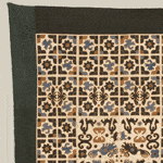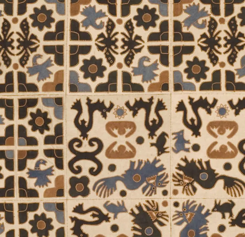 This intricate piece comprises twenty-four cotton appliqué panels skillfully stitched together, bordered by a wide frame of indigo/black cotton. It's in excellent condition, measuring 42 inches by 60 inches (107cm x 152cm).