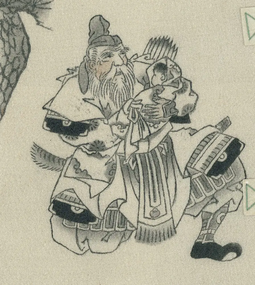 This particular banner depicts the legendary figure Takenouchi-no-Sukune holding the baby Ojin. He's often called "Valiant Old Bear" and is a revered character in Japanese folklore. The legend tells of Takenouchi-no-Sukune's long life, attributed to drinking daily from a sacred well, which allowed him to live over 300 years. He served as a guardian to the future-emperor Ojin during the third century. In Edo-era depictions, he's seen dressed in full armor, emphasizing his military role, while Meiji-era renditions often portray him in court attire and nobleman's cap, symbolizing his loyal advisory role.