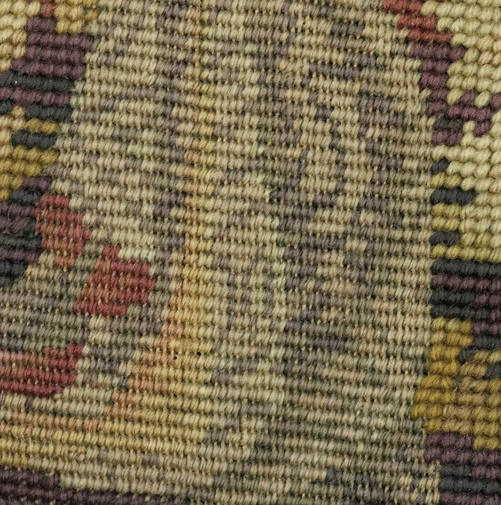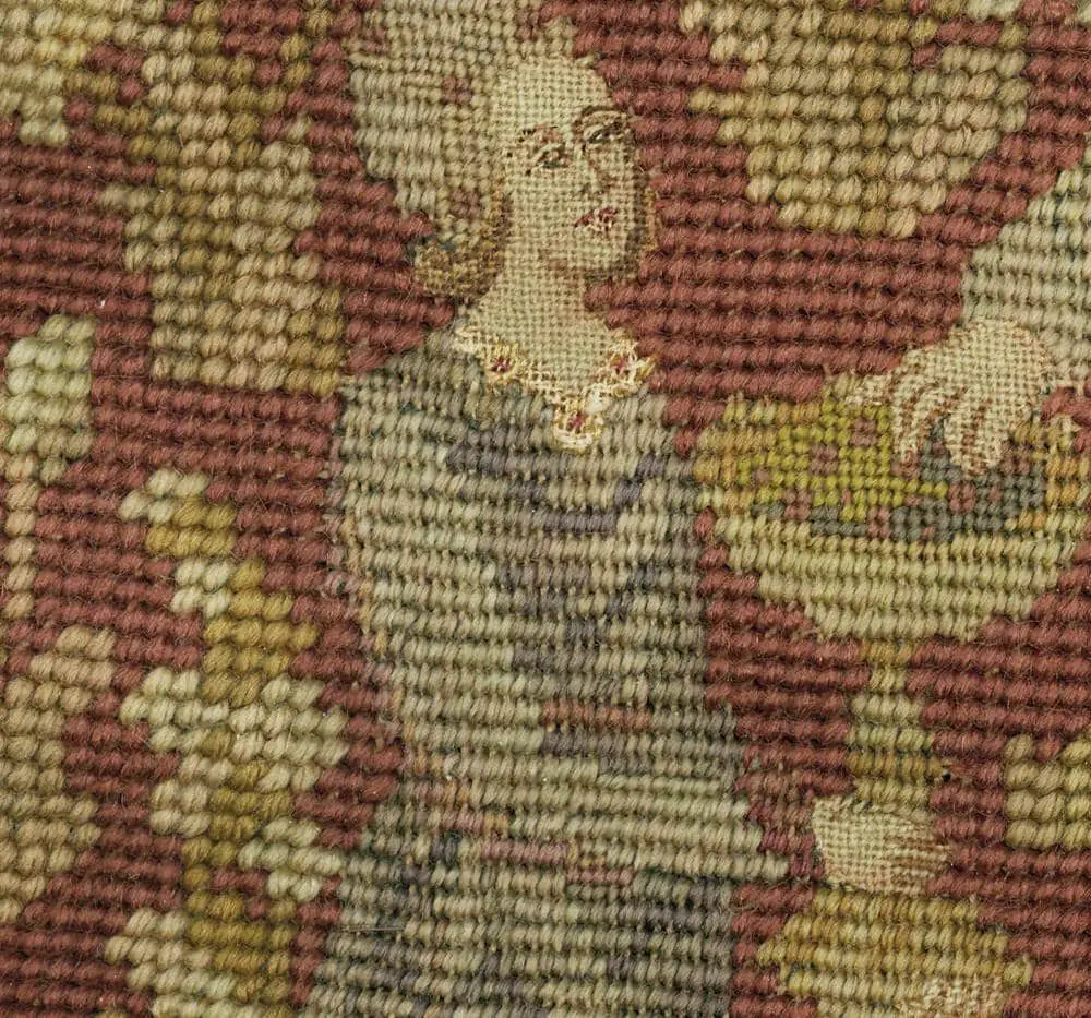 This wool needlepoint fragment features two ladies depicted in petit-point, with silk used for clothing and jewelry highlights. It appears to have been cut from the seat or back of a chair. The fragment is in good condition and measures 15 inches by 16 inches (38 cm x 41 cm).