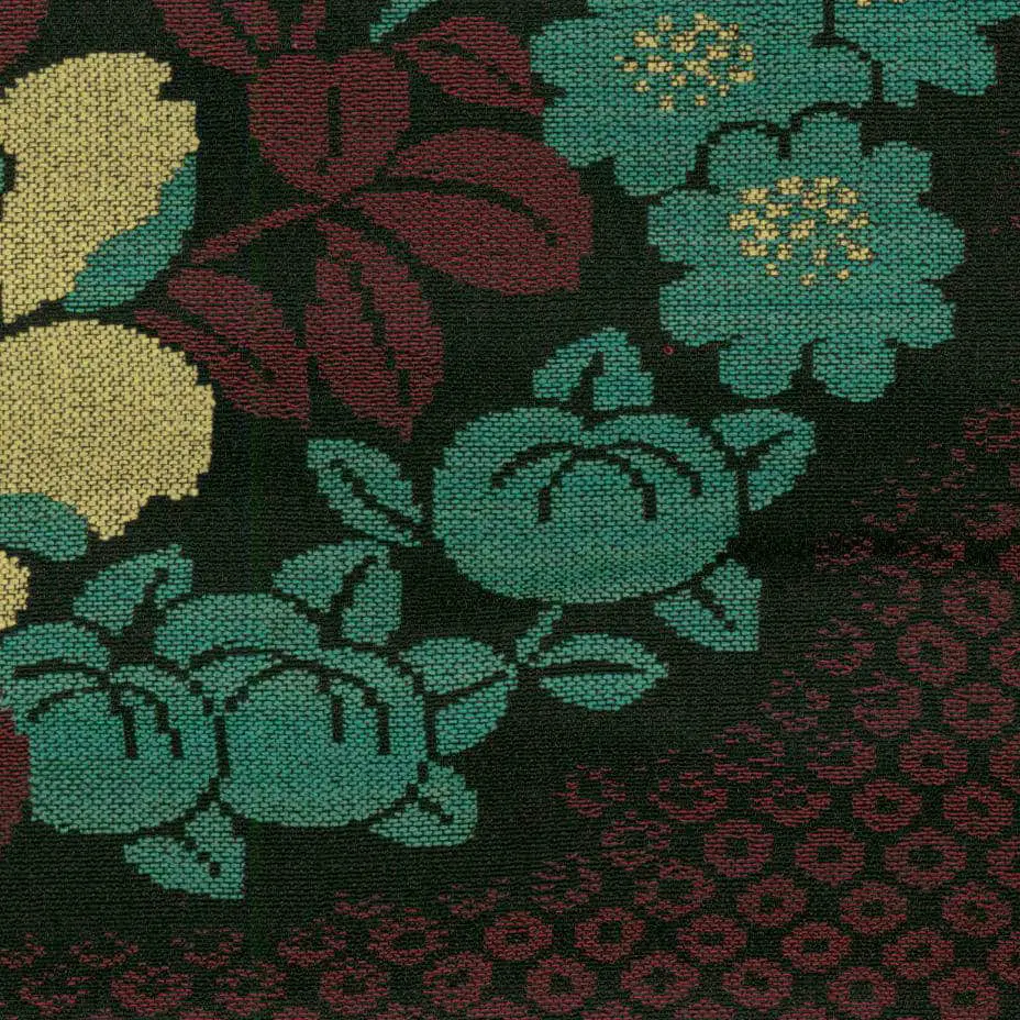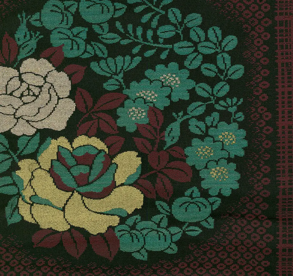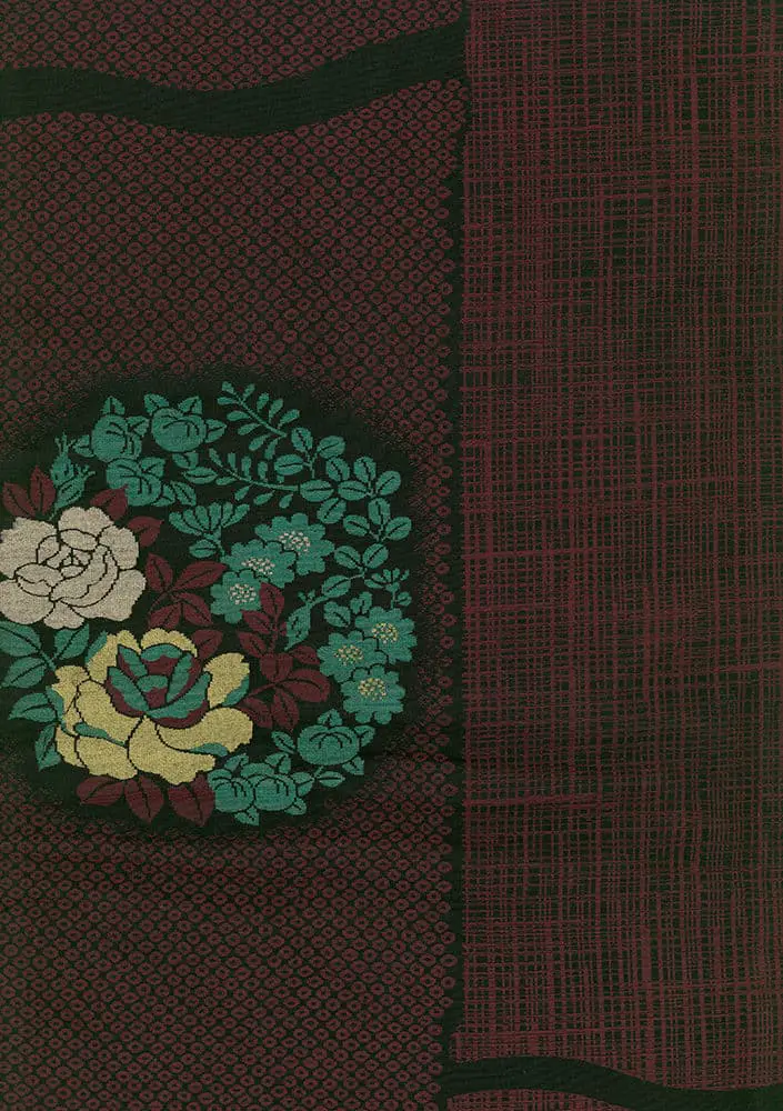 This omeshi silk kimono showcases woven floral roundels set against abstract bamboo stalks. It's in excellent condition overall. Its measurements are approximately 49 inches from sleeve-end to sleeve-end and 59 inches in height, or about 124 centimeters by 150 centimeters.