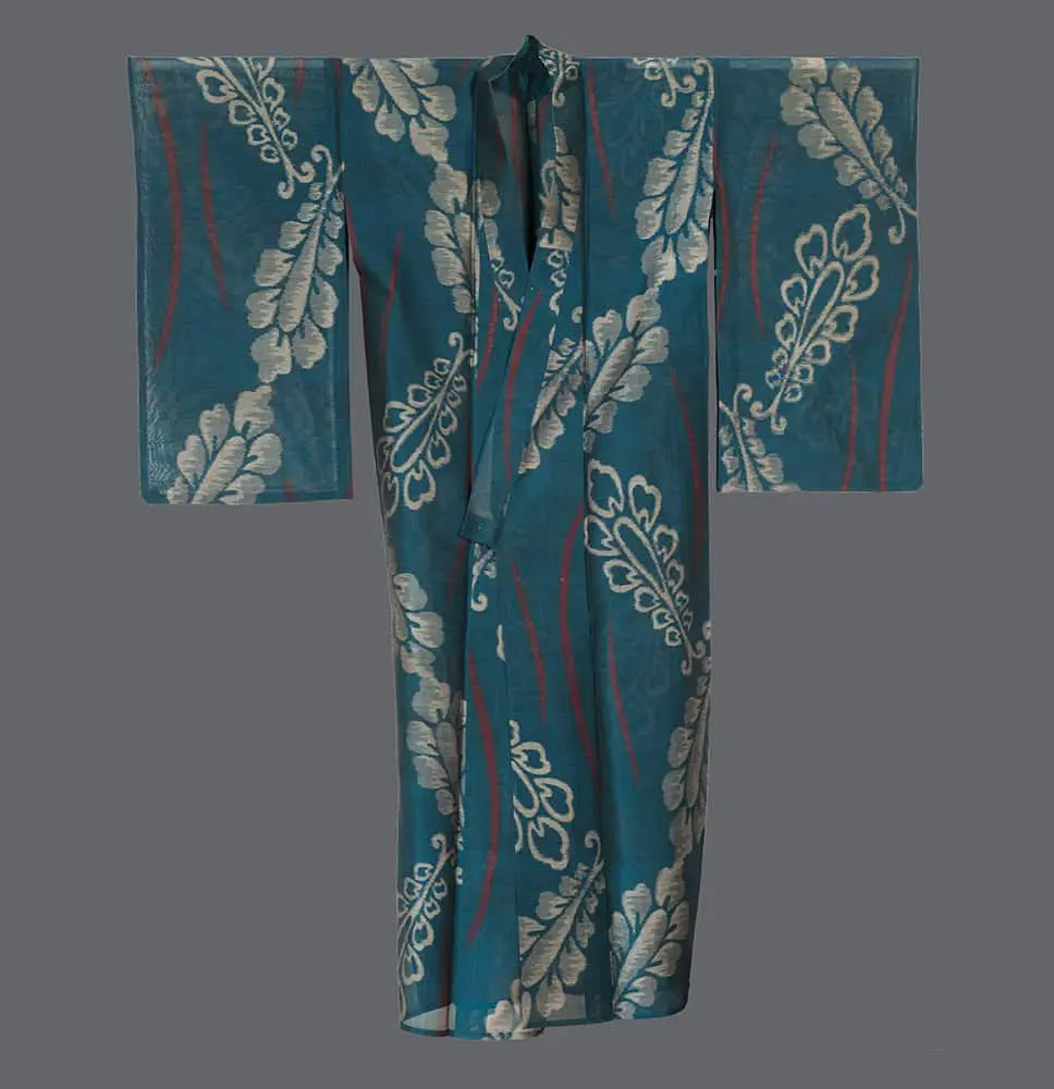 This unlined omeshi silk summer kimono showcases large floral motifs. Measuring 49 inches (124 cm) from sleeve-end to sleeve-end, it stands at a height of 58 inches (147 cm).