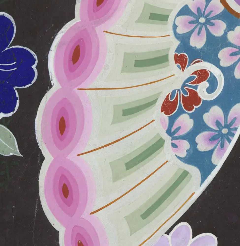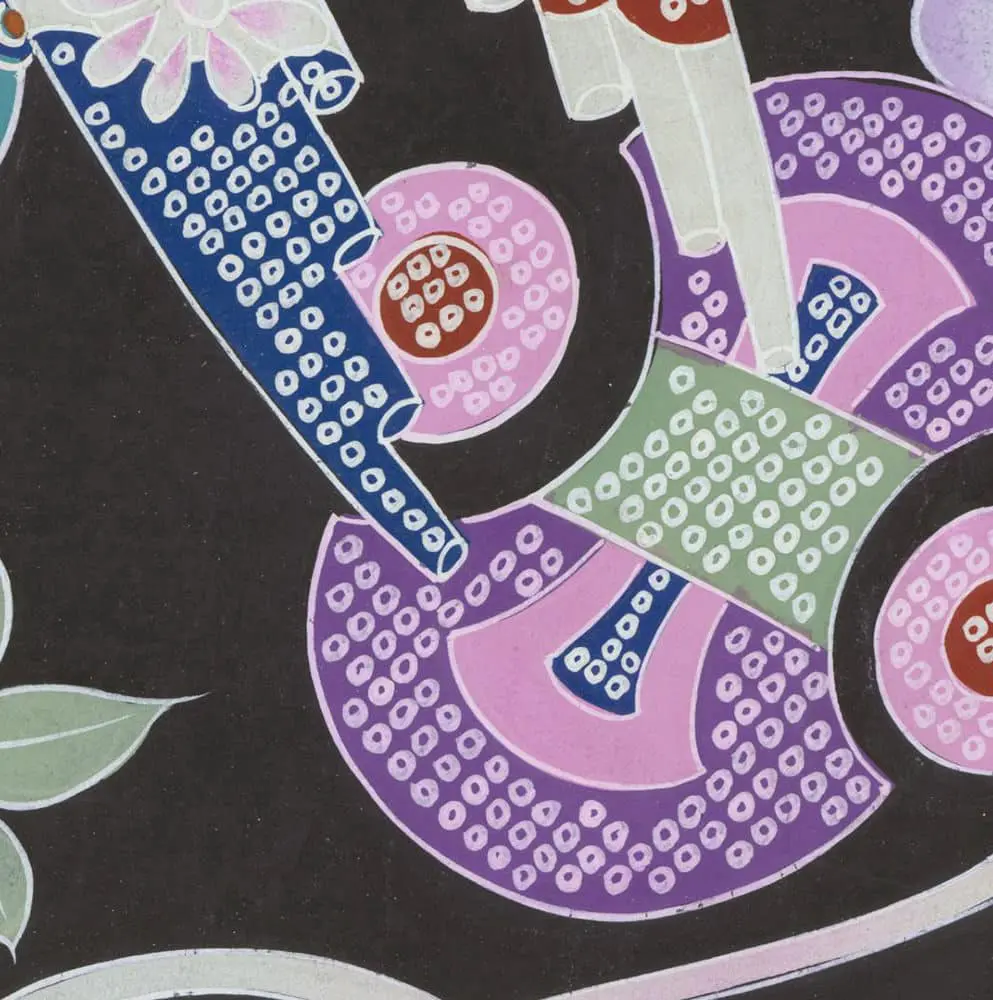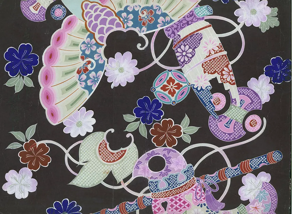 This watercolor on paper is an original and unique artwork crafted by a Japanese artist for the purpose of transposing its design to yuzen resist-dye work on a silk kimono. It's in very good condition and measures 18 inches by 12 inches (46 cm x 30 cm).
