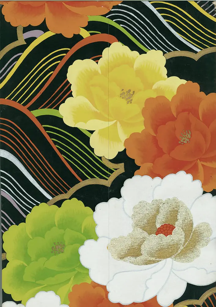 This original and distinctive artwork, composed of paint and painted appliques on thick paper, originated from a talented Japanese artist in Kyoto's renowned Nishijin district. It served as the design inspiration for a woven obi, a wide traditional Japanese belt. It's in very good condition and measures 12 inches (30 cm) by 30 inches (76 cm).