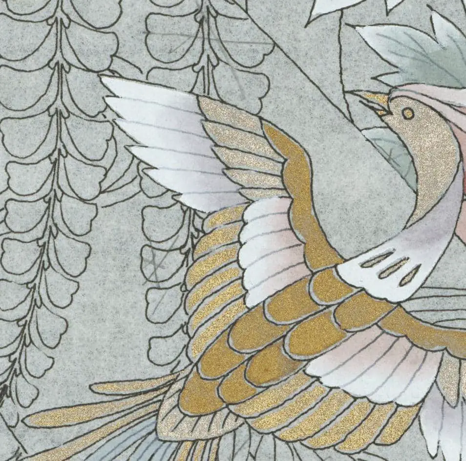 This original and distinctive artwork was crafted using ink, pencil, and glitter on thin semi-transparent rice paper. It was skillfully created by a Japanese artist in Kyoto's renowned Nishijin district. This artwork served as the inspiration for a woven obi (a wide traditional Japanese belt). It's in very good condition and measures 12 inches (30 cm) by 29 inches (74 cm).