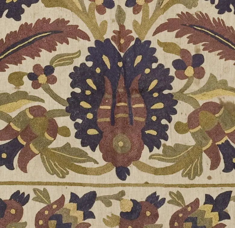 This exceptional reproduction of a 17th-century Ottoman cover features precise hand-machine chain-stitch embroidery on a cotton background. While it showcases some light staining on the background, it remains in very good condition overall. Its measurements are 47 inches by 47 inches (119 cm x 119 cm).