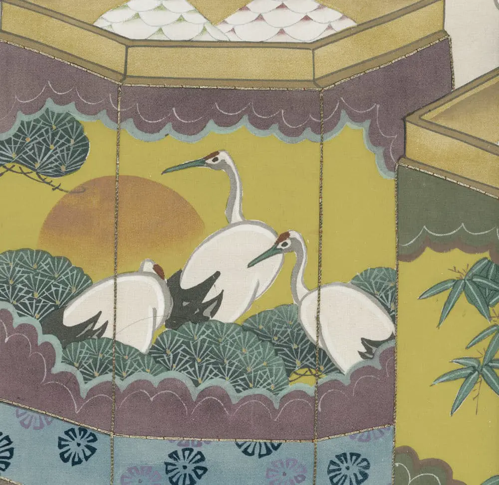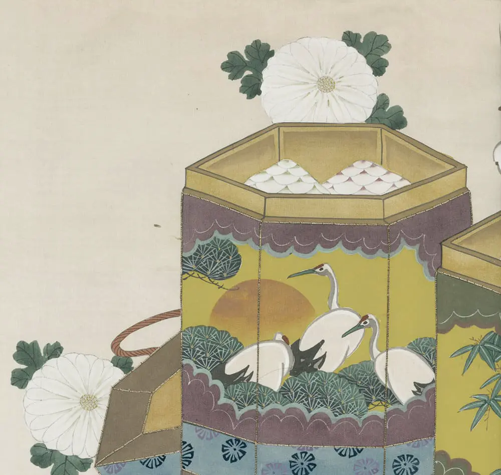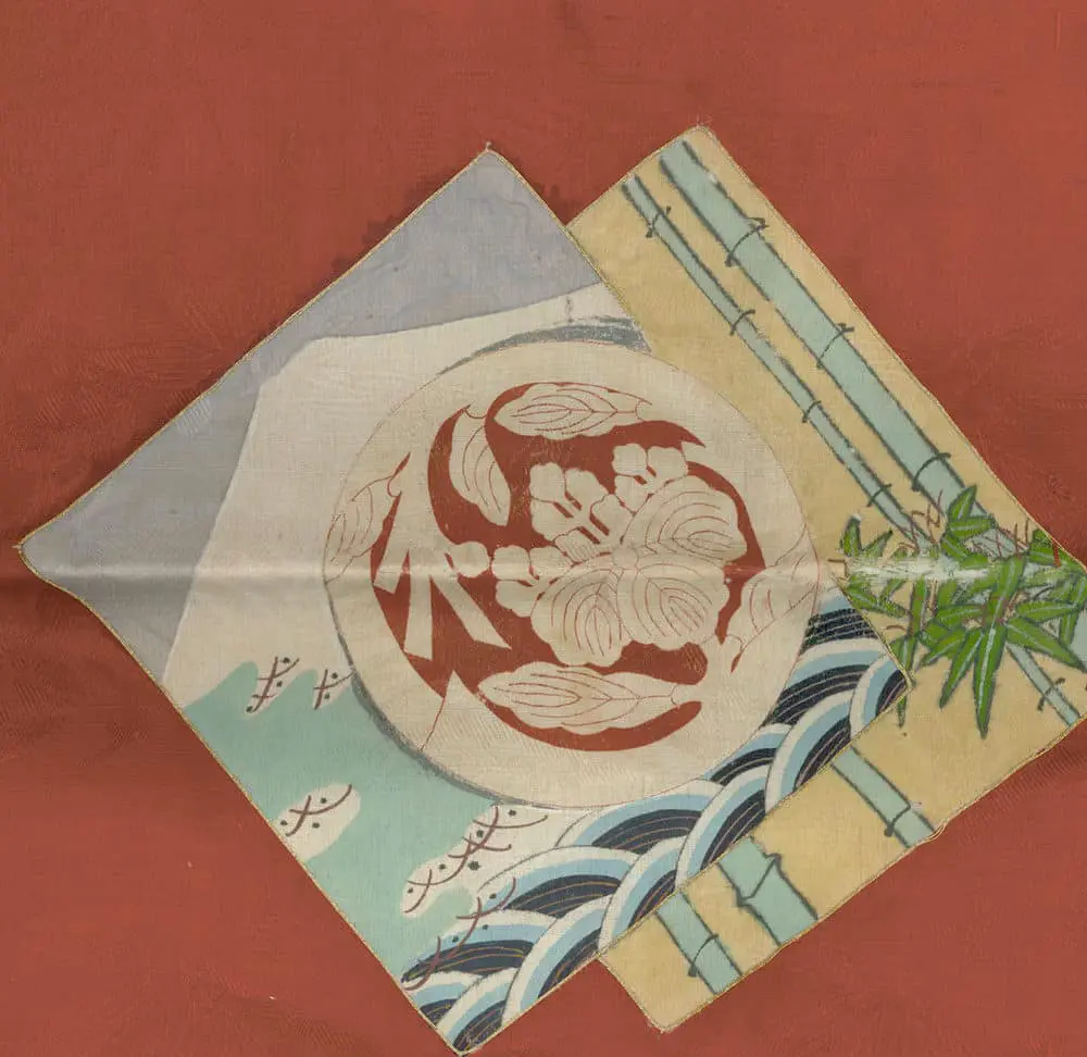 This silk gift cover showcases intricate patterns of 'kaioke,' the hexagonal container traditionally used to store clam shells for the ancient shell matching game called 'kaiawase.' The patterns appear to be painted, complemented by silk embroidery highlights. It remains in very good condition, albeit with minor staining present on both the front and back. The measurements come to about 26 inches by 27 inches (66 cm x 69 cm).