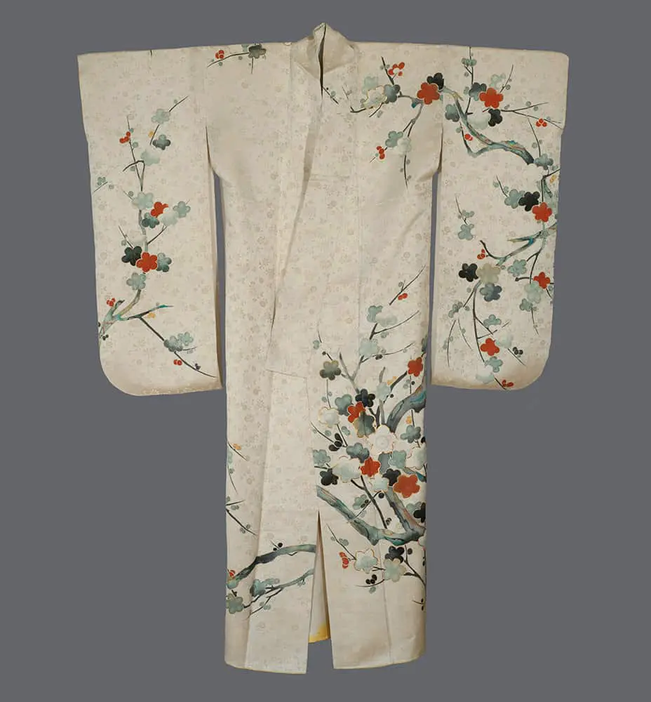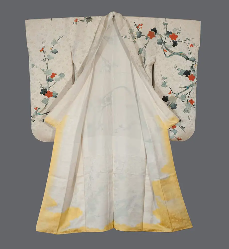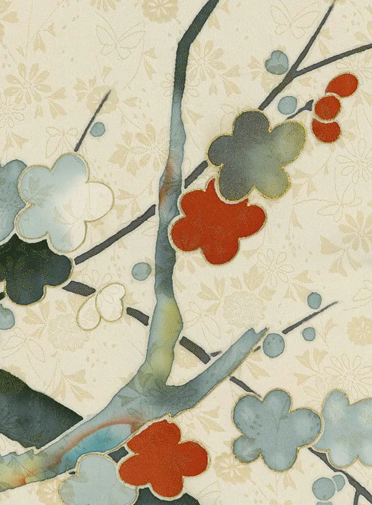 This rinzu silk furisode represents a beautiful fusion of traditional Japanese textile artistry with the naturalistic aesthetic that has long characterized Japanese decorative arts. The kimono features an elegant composition of ume (plum blossom) branches gracefully cascading across the cream-colored damask ground, painted with the sophisticated yuzen resist-dyeing technique combined with pigment dyes. The artistic treatment evokes the classical Japanese painting tradition of kachō-ga (bird-and-flower painting), where natural subjects are rendered with both botanical accuracy and poetic sensibility.