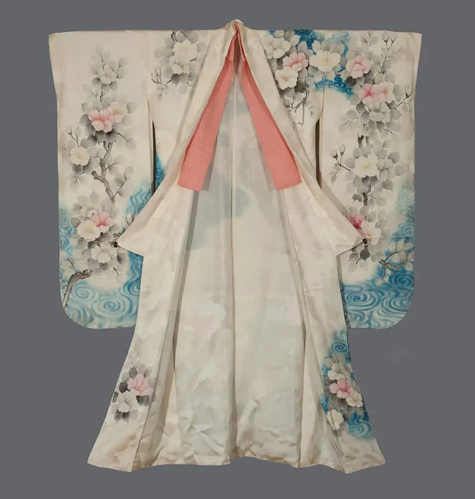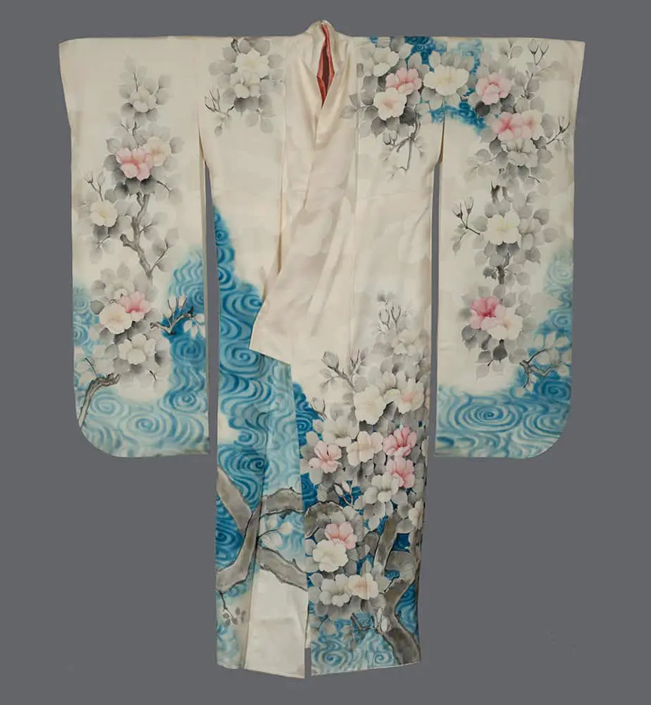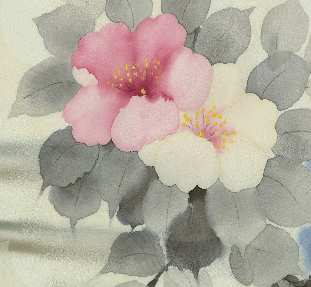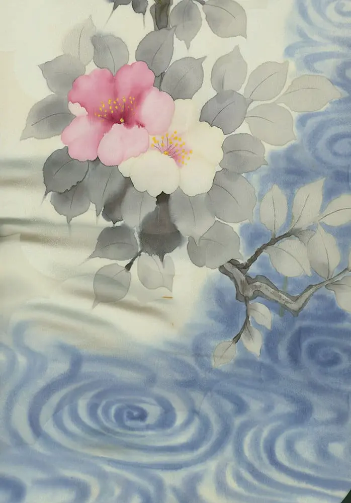 This rinzu silk furisode exemplifies the revival of traditional hand-painted techniques during Japan's economic boom period, when there was renewed interest in luxury craftsmanship and cultural heritage. The garment presents a masterful composition of camellia blossoms arranged against flowing water motifs, rendered in a sophisticated palette that balances naturalistic representation with artistic interpretation. The camellias, painted in subtle gradations of white and pale pink with darker undertones, demonstrate the refined brush techniques of traditional Japanese textile painting, while their placement creates a dynamic visual rhythm across the garment's surface.