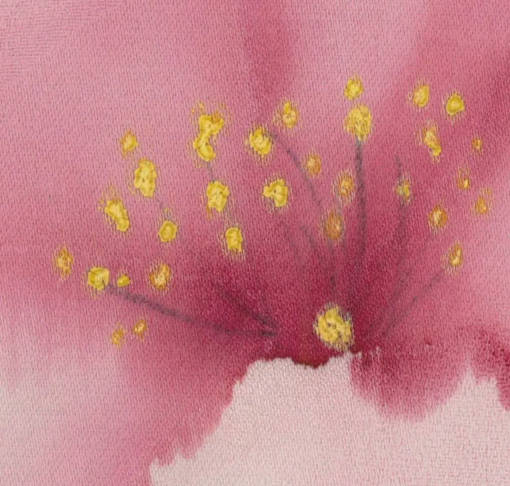 The detail images reveal the sophisticated execution of the hand-painting technique, showing how individual brush strokes create dimensional petals that seem to float against a dreamy background. The soft color transitions and the visible texture of the rinzu silk weave create an almost impressionistic quality that recalls both traditional Japanese painting and contemporary artistic sensibilities. This furisode represents a synthesis of traditional craftsmanship with modern luxury consumption, embodying Japan's cultural confidence during its period of economic prosperity while maintaining deep connections to classical Japanese aesthetics of mono no aware - the poignant awareness of the impermanence of all things.