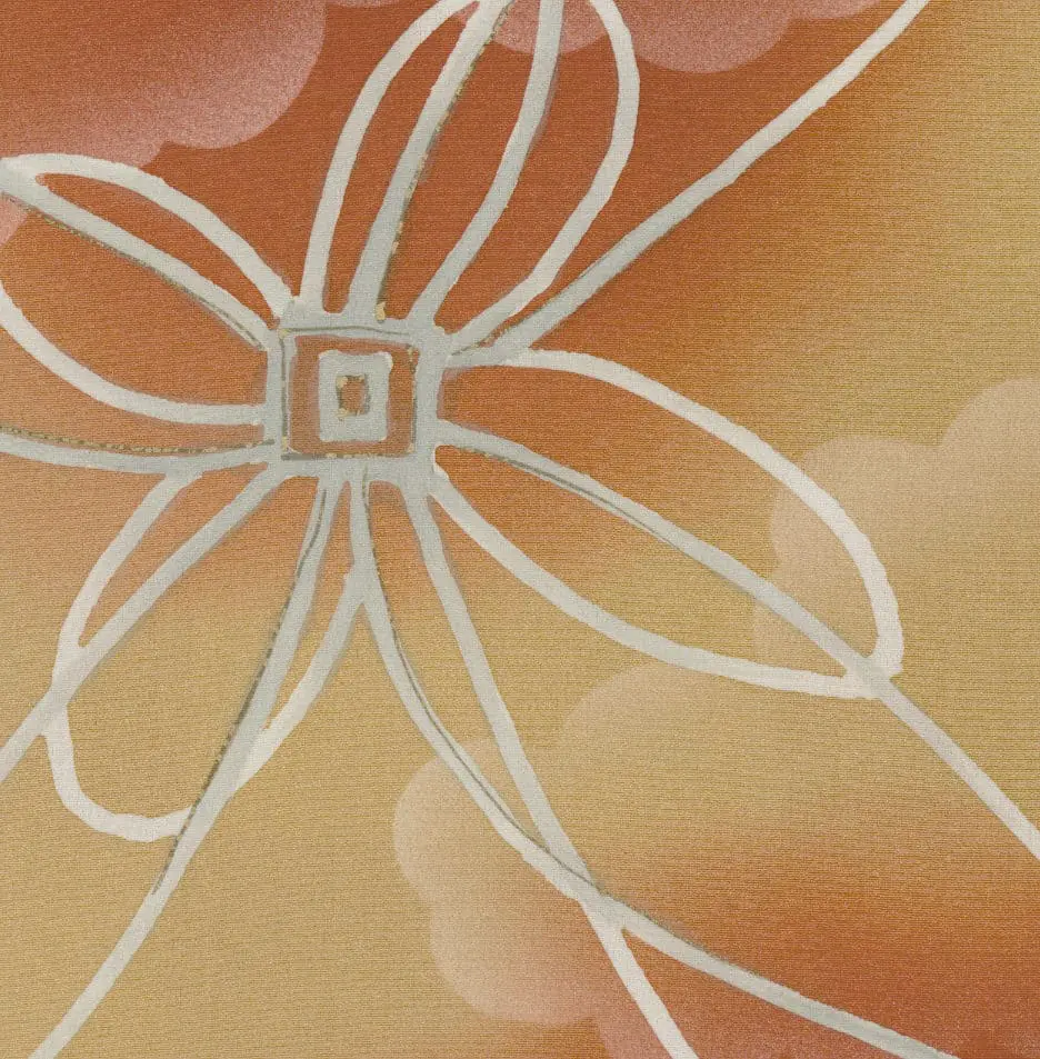 This chirimen silk jacket presents a masterful synthesis of traditional Japanese decorative techniques, combining atmospheric cloud formations with delicate floral motifs against warm golden and amber tones that evoke autumn's ephemeral beauty. The brushed cloud patterns create soft, diffused areas of deeper amber that drift across the fabric like mist, while the hand-painted flowers are rendered in elegant white linear strokes that suggest cherry blossoms or other seasonal blooms. The detail image reveals the sophisticated simplicity of these floral forms, with their geometric centers and radiating petals that balance naturalistic inspiration with stylized abstraction. Horizontal gold thread inserts punctuate the design, adding luminous accents that catch light and create textural contrast against the soft silk surface.