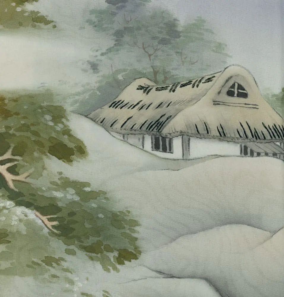 The rinzu silk background provides a lustrous, subtly textured surface that enhances the painted elements, while the single family crest (mon) near the collar indicates this was a formal garment for ceremonial occasions. The artistic style reflects influences from both classical Japanese landscape painting and the naturalistic tendencies that emerged during the Taisho and early Showa periods, when kimono design began incorporating more realistic and atmospheric approaches to nature scenes. This piece represents the height of kimono as wearable art, transforming the body into a canvas for contemplative landscape imagery that embodies the Japanese aesthetic ideals of wabi-sabi and mono no aware - finding beauty in transience and the subtle melancholy of natural cycles.